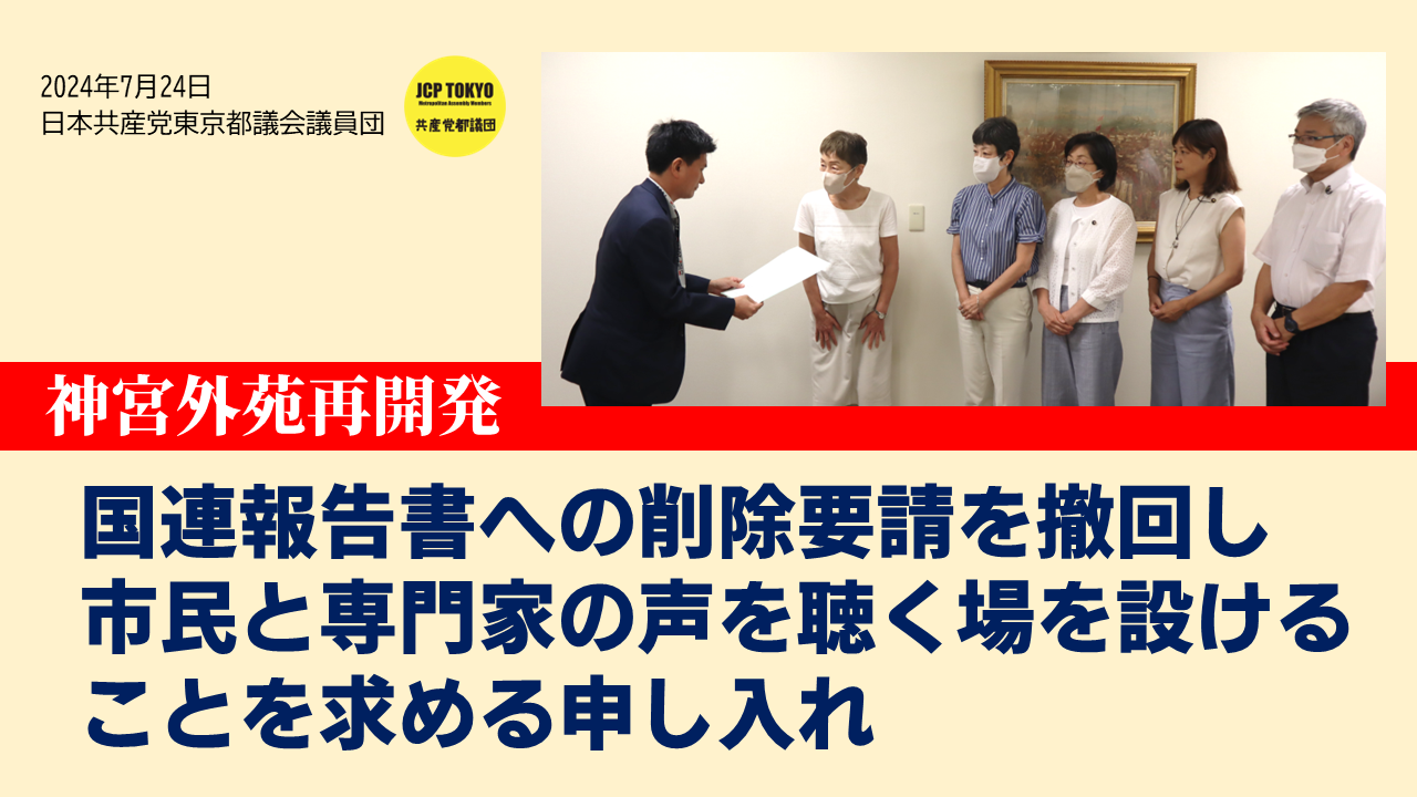 5月1日、国連「ビジネスと人権」作業部会の報告書は、市民の声を広く踏まえることなどの不十分さから、神宮外苑再開発が人権に悪影響を及ぼす可能性があるとの懸念を表明しました。国はその全面削除を要請しましたが、この国の意見を検討・作成したのは東京都であることが、わが党の国会質疑で明らかになりました。