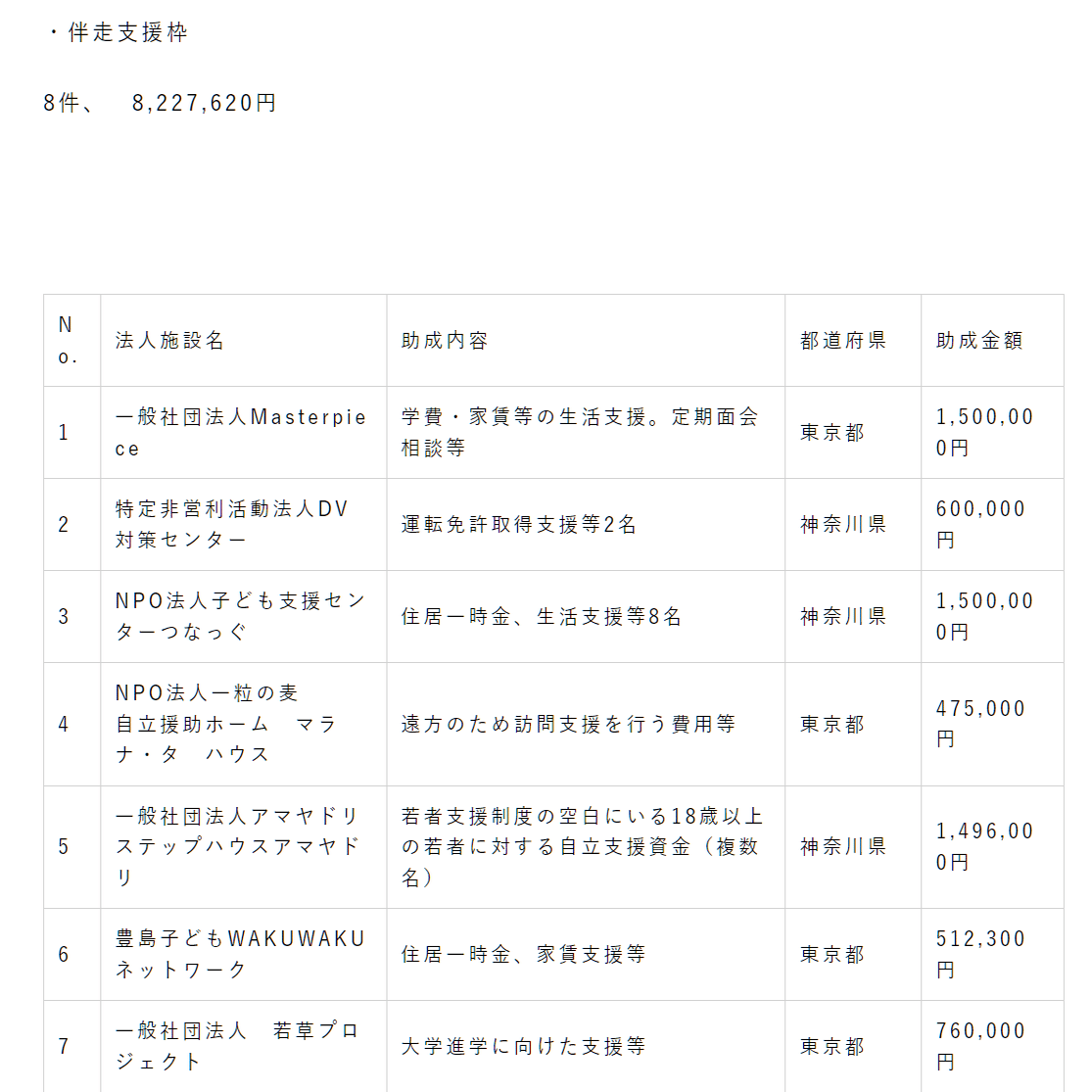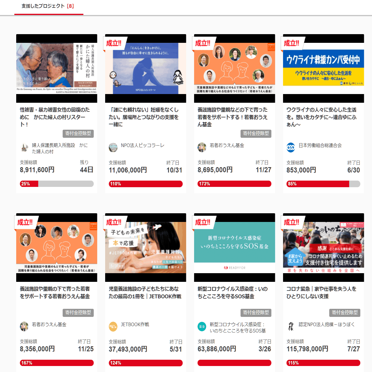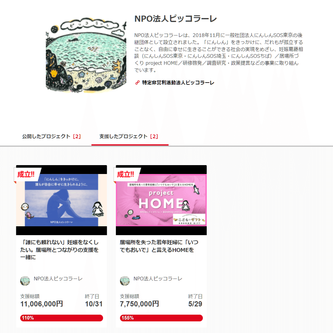 支援したプロジェクト。抱樸、ピッコラーレ、おうえん基金、日本労働組合総連合会。わっはははは」