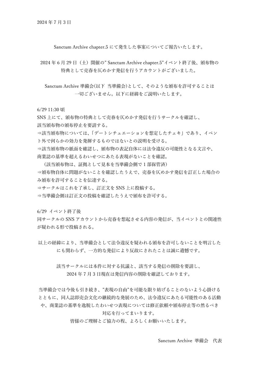 当日の頒布物の内容確認でロムの内容やチェキ自体にオフパコをほのめかす文言はなかった