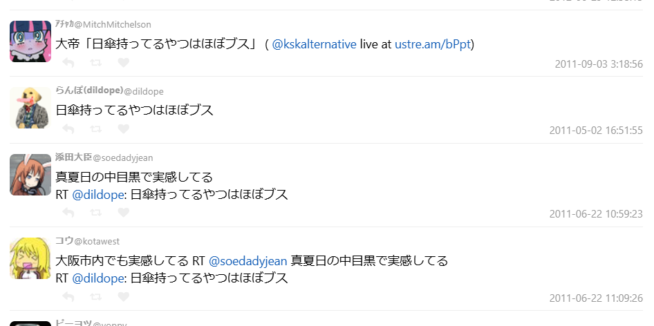 「日傘さしてる女はブス」「日傘してるブスむかつく、へし折りたい」という人達 - Togetter [トゥギャッター]
