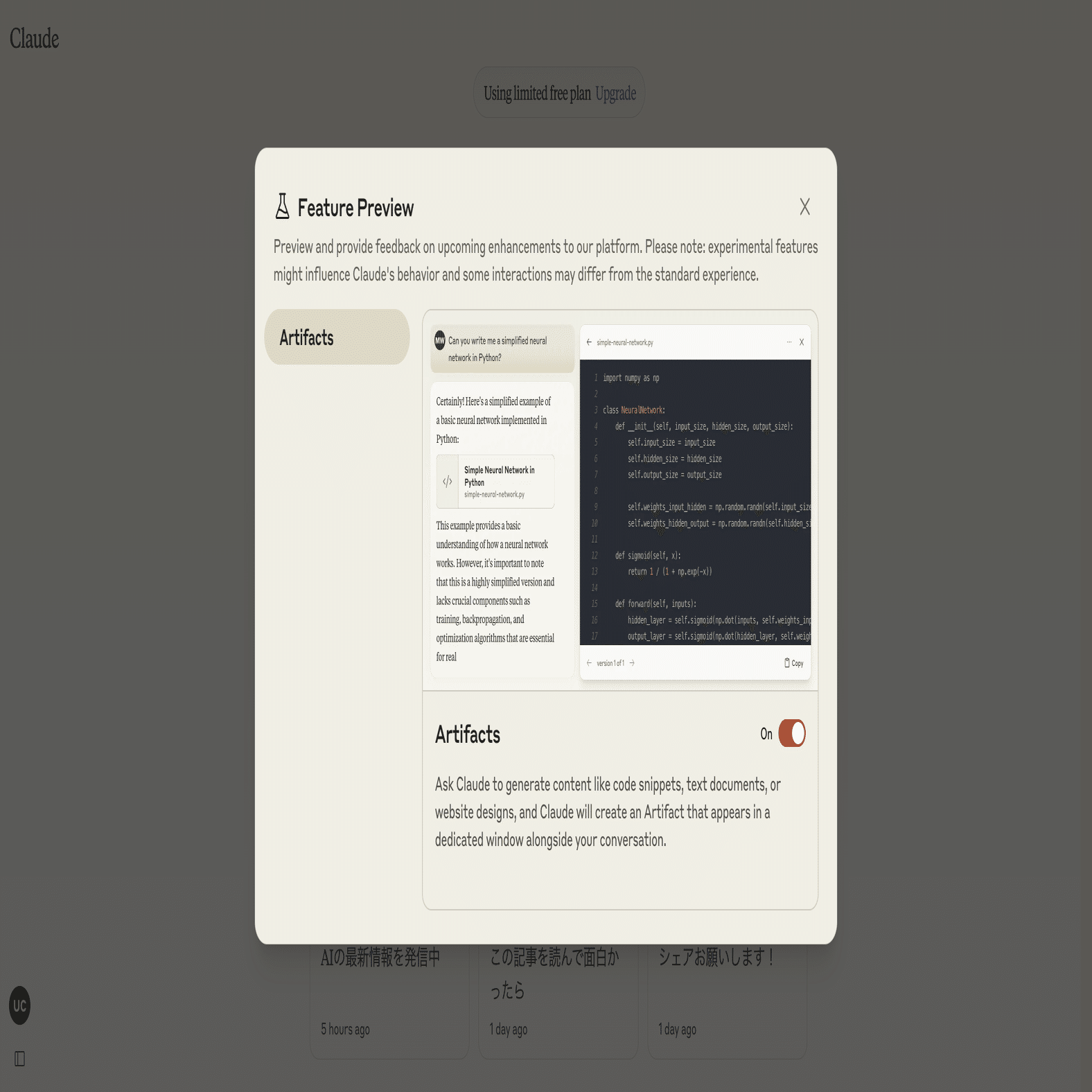 まず、Claude 3.5 Sonnetにアクセスして、Artifacts機能を有効にしましょう。次に、私が用意したコードをClaude 3.5 Sonnetに入力します。このコードは、ArtifactsとGemini nanoを連携させる魔法の呪文みたいなものです。