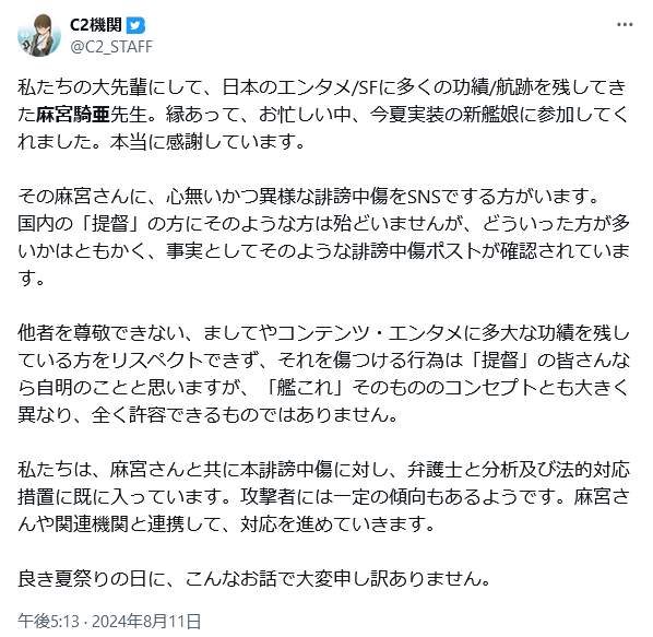 麻宮氏のレキシントン炎上事件、艦これ運営が声明「レジェンド作家をリスペクトするのが艦これのコンセプト」