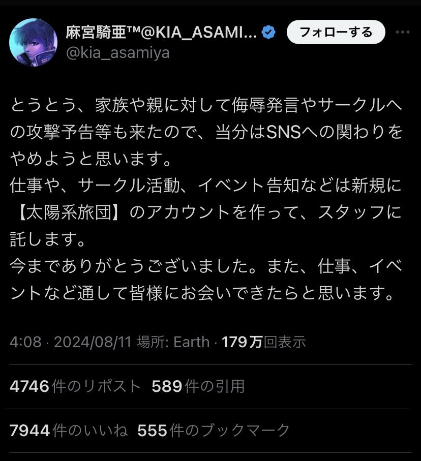 「コンテンツ・エンタメに多大な功績を残している方をリスペクトできず」って書き方とか相変わらず色々余計