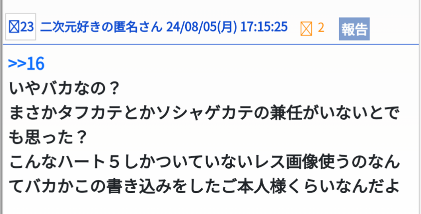 こんなんやってるから嫌われるのでは?対立煽りの荒らしだろうけども - 51二次元好きの匿名さん24/08/15(木) 12:15:32