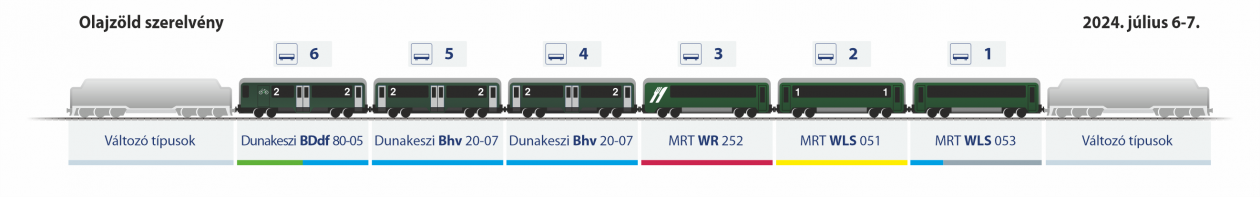 Megannyi autentikus szerelvényösszeállítást láthatnak az érdeklődők a hétvégén. Forgalomba áll egy olajzöld személyvonat, melyben a MÁV Rail Tours AB 305-ös és B 821-es kocsija mellett két olajzöld Bhv 20-07 és egy BDdf 80-05 közlekedik. A szerelvény a 109-es és 110-es vasútvonalakon áll forgalomba, élén a 424 247-es gőzmozdonnyal és bordó szinkron Csörgővel.