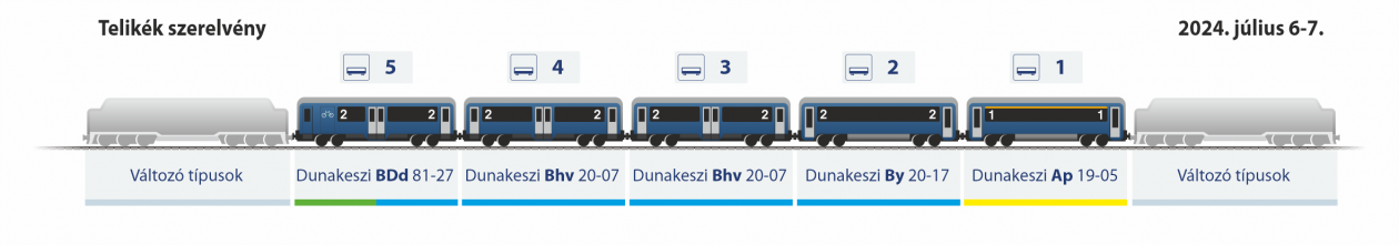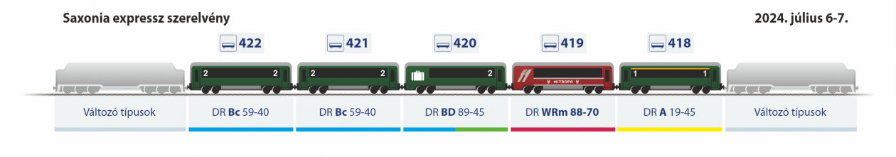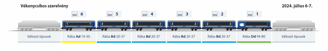 | Vastagcsíkos gyorsvonat | Ad 19-30 + 3 Bd 20-37 + Dd 94-80 | Alapszerelvény | Ad 19-30 + 3 Bd 20-37 + Dd 94-80 | Telikék személyvonat |