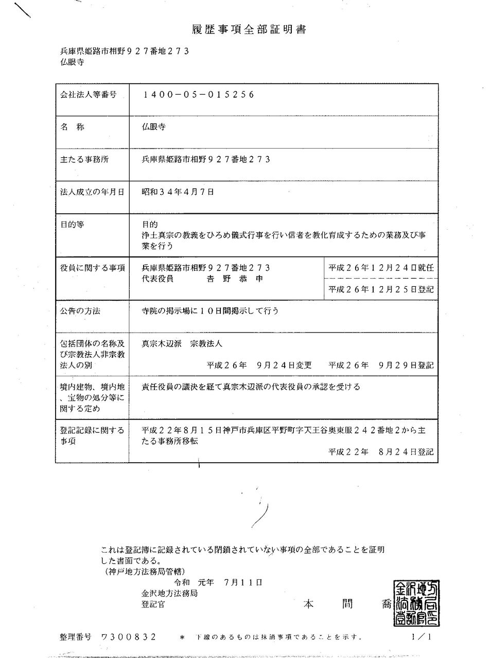 (吉野日神(拳骨和尚)の仏眼寺住職就任を記している神戸地方法務局の登記簿)