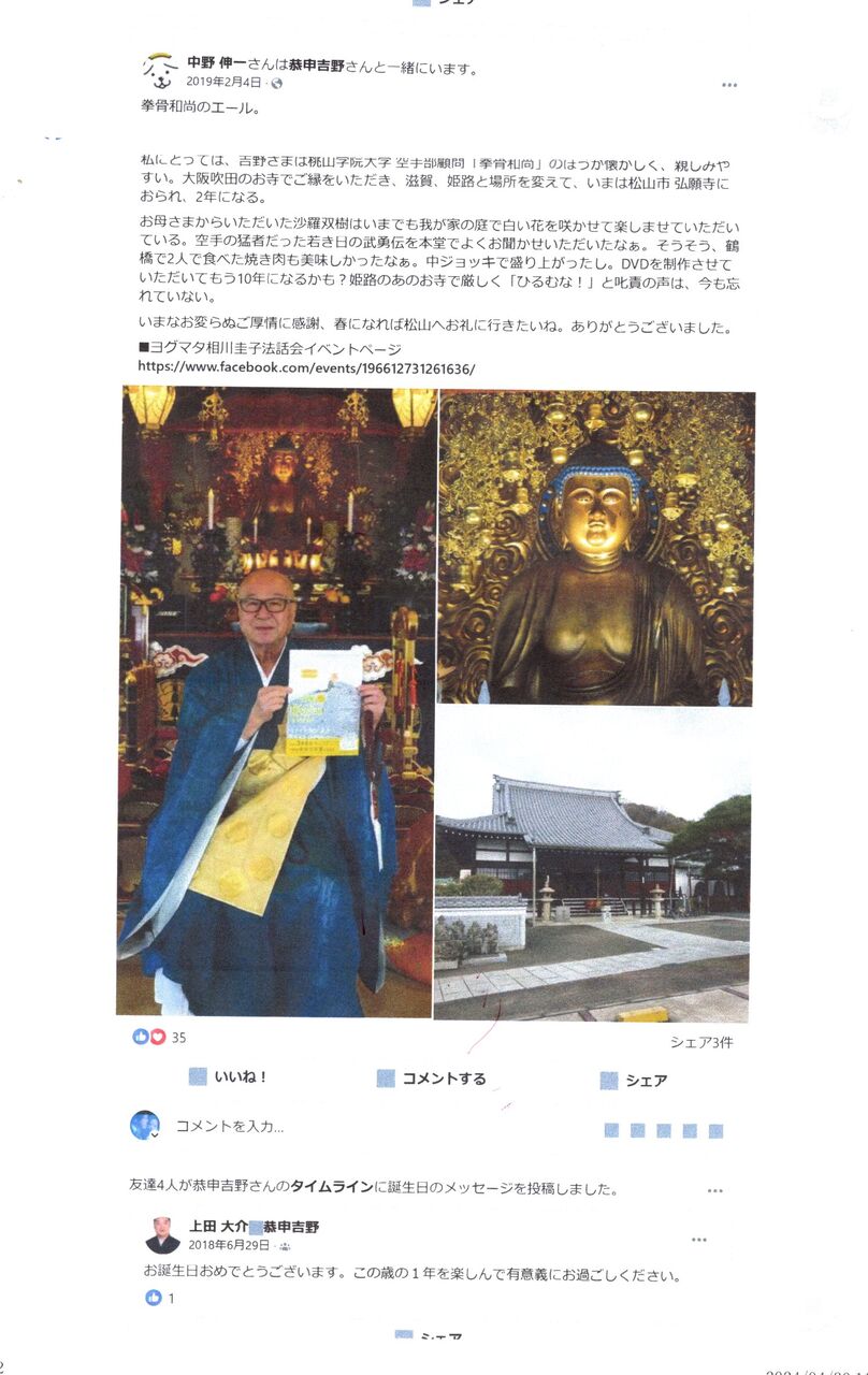 (「facebook」のある人のwebサイトに、浄土宗の袈裟衣󠄂を着て愛媛県松山市の浄土宗単立寺院・弘願寺「住職」として登場した吉野日神(拳骨和尚)