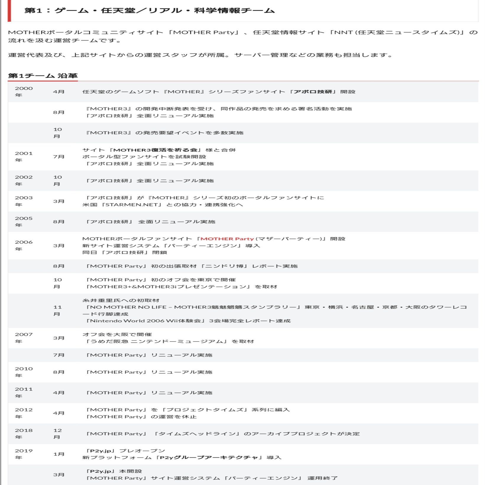 以前のnoteで紹介したP2yの沿革が載っていた当時のネット魚拓でもP2y第一チームの沿革にアポロ船長が現在も管理しているMOTHER partyの経歴は確認できますが、任天堂ニュースタイムズはいつ開設したのかすらはっきりとわかっていません。