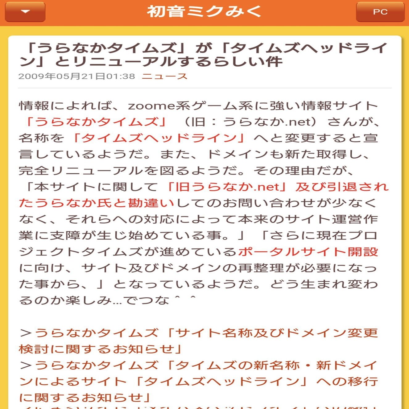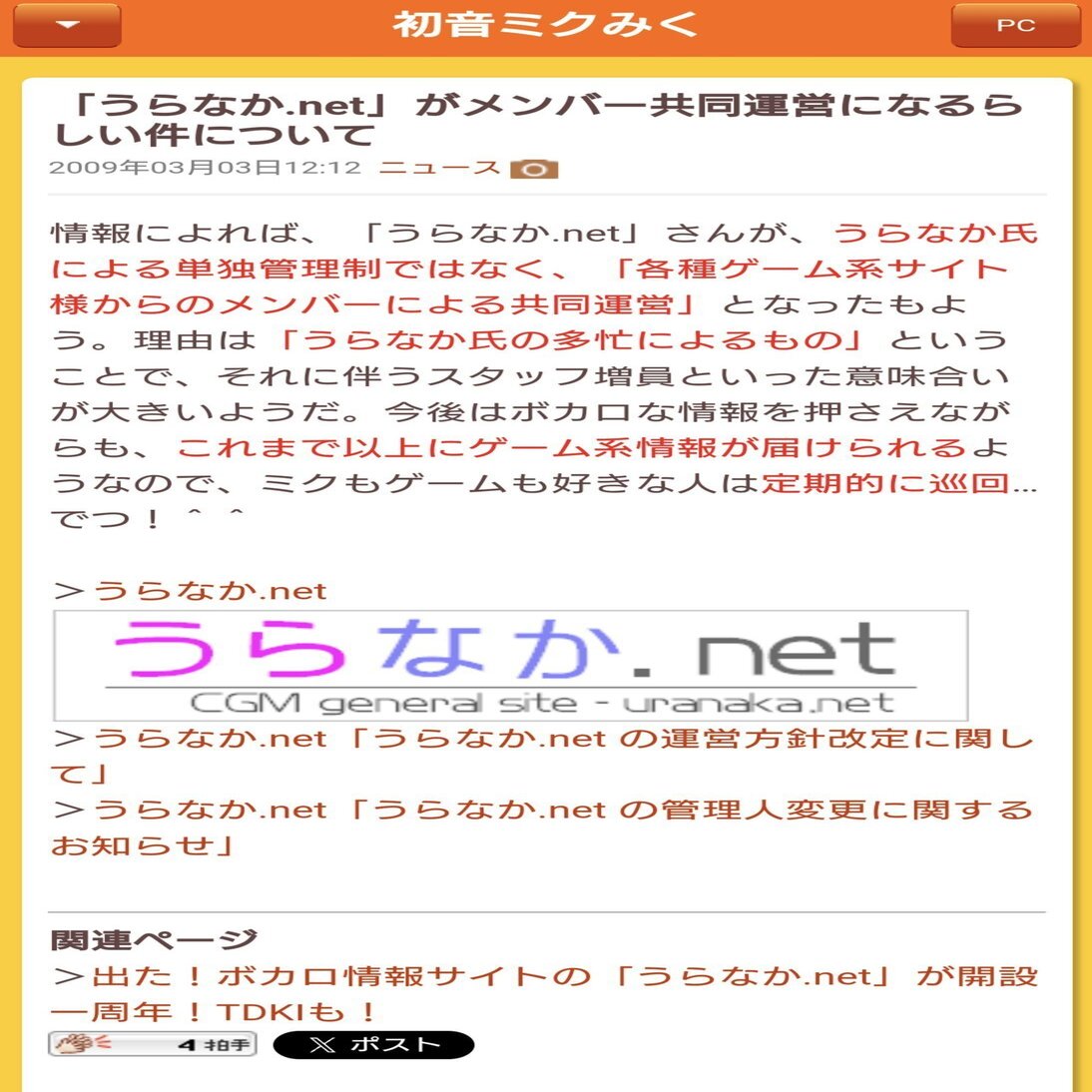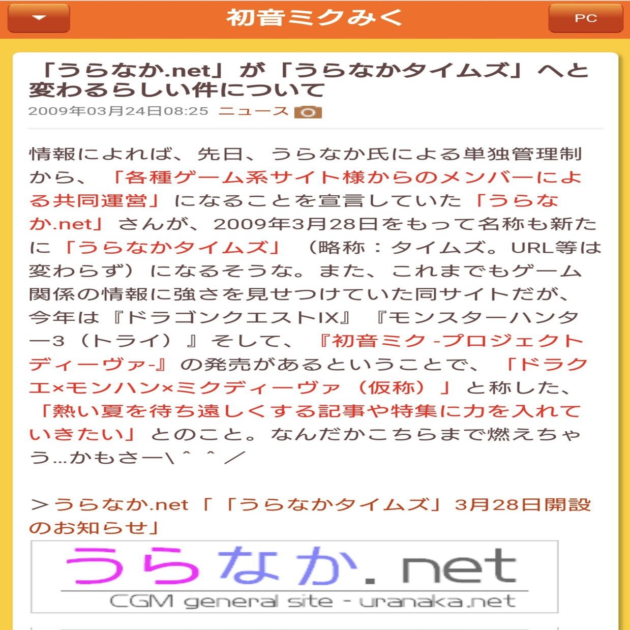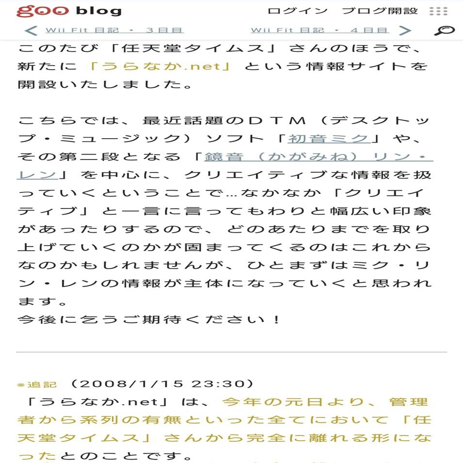 うらなか.netは2007年末に開設され、2008年明けに任天堂ニュースタイムズから独立する形でサイトが運営されたのは前項でも説明しましたが、任天堂ニュースタイムズでは任天堂系のニュースだけでなく、初音ミクのニュースも扱うようになっていたようです。
