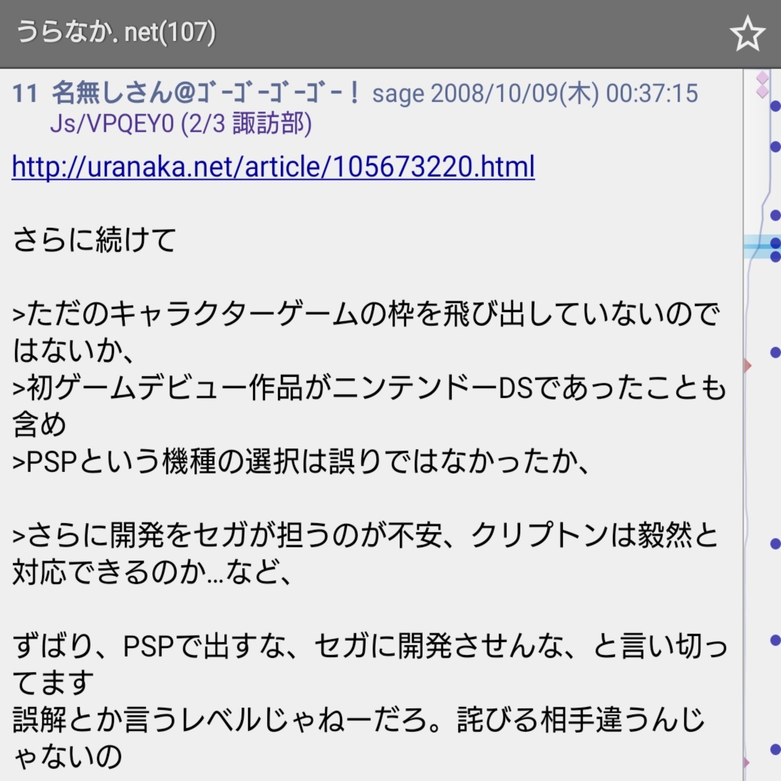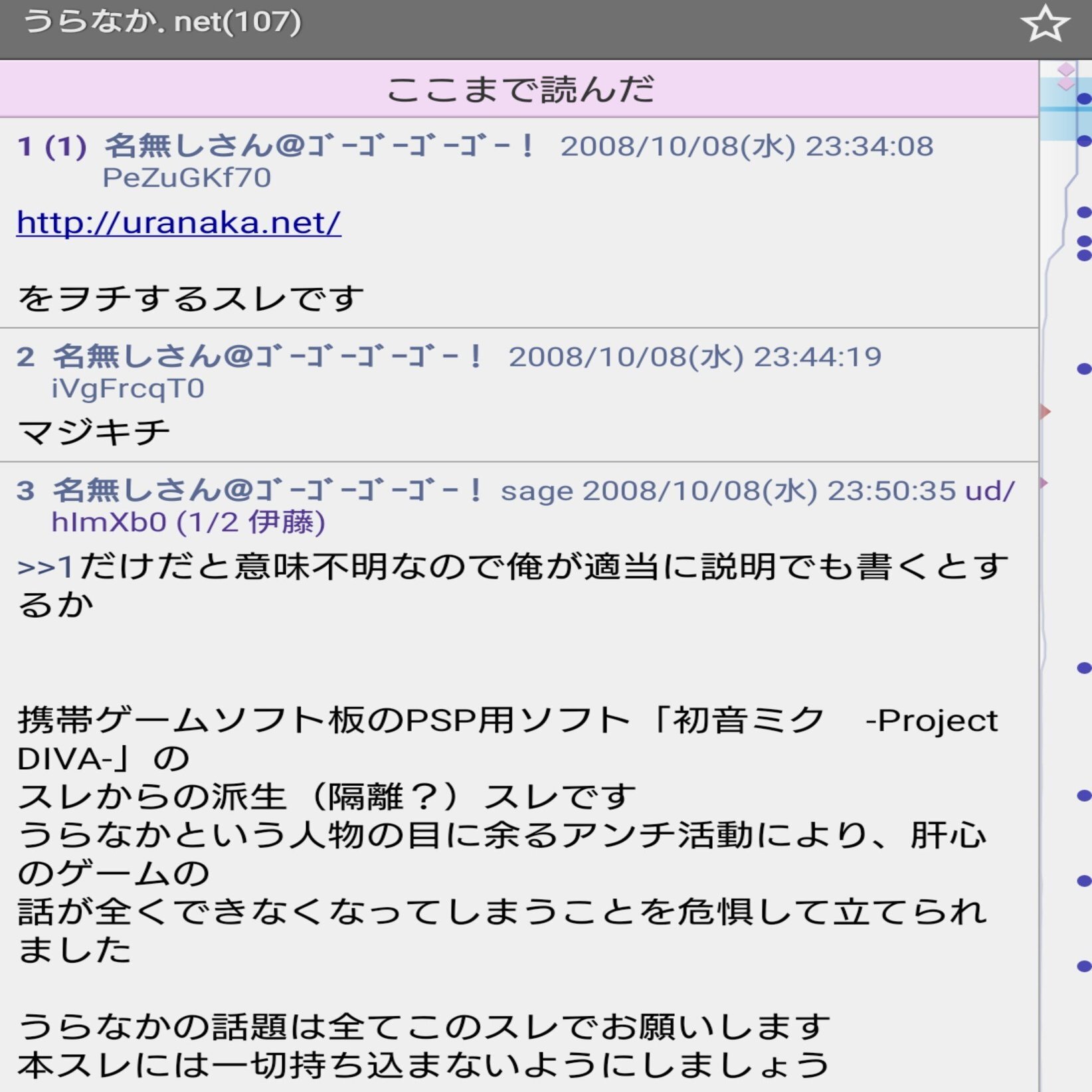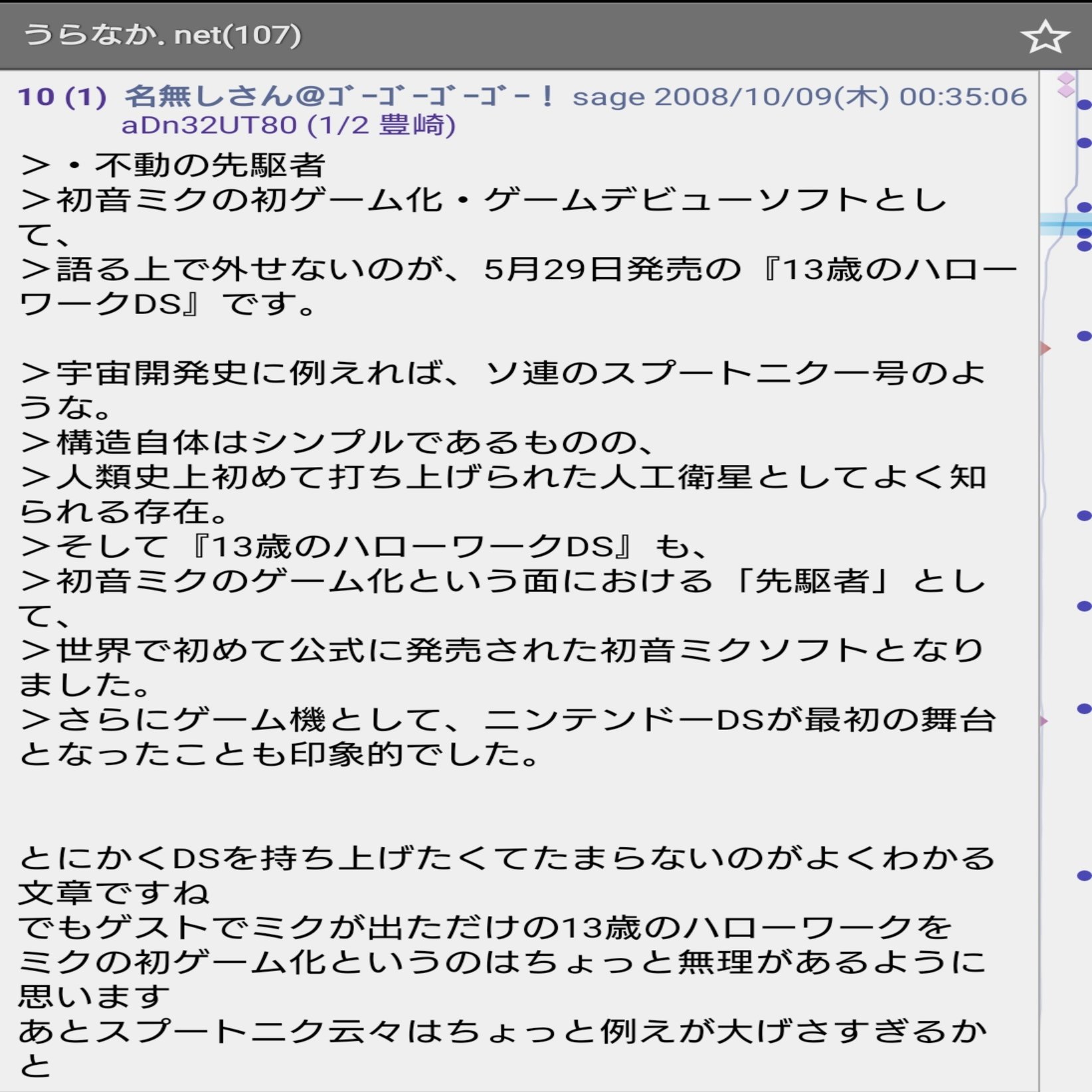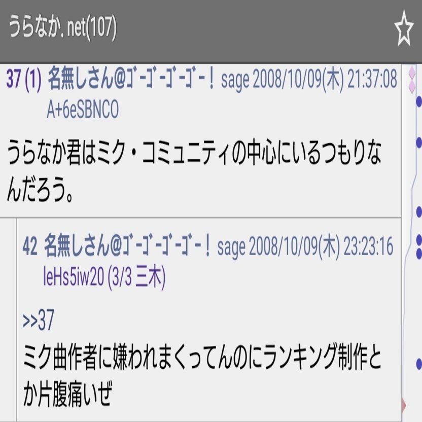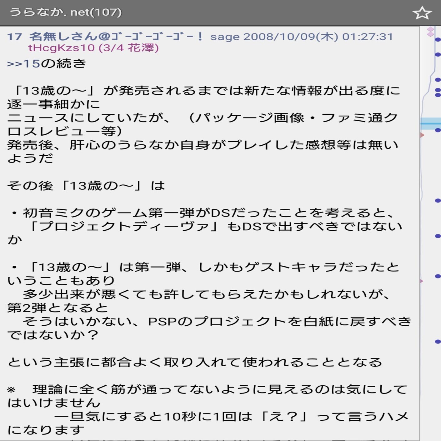 うらなか.netの専用スレが立った経緯は2009年7月2日に発売されたプレイステーションポータブル専用ソフト「初音ミク -Project DIVA-」の専用スレがうらなか.netの話題によって機能しなくなる事を受けてというものであり、そこまで調べきれていませんが当時はうらなか.netの読者がうらなかの発言や記事を引用してスレを荒らしていた、という事態が起きていたというのは容易に想像できるのではないのでしょうか?(前回のnoteの流れを見るにうらなか自身が自作自演の工作活動を行っていた可能性も否めませんが) うらなかはいわゆる強烈な任天堂信者と呼ばれるたぐいの人間だったようでゲストキャラクターとして登場しただけのニンテンドーDSのゲームを初音ミク初のゲーム化として強弁していたようです。