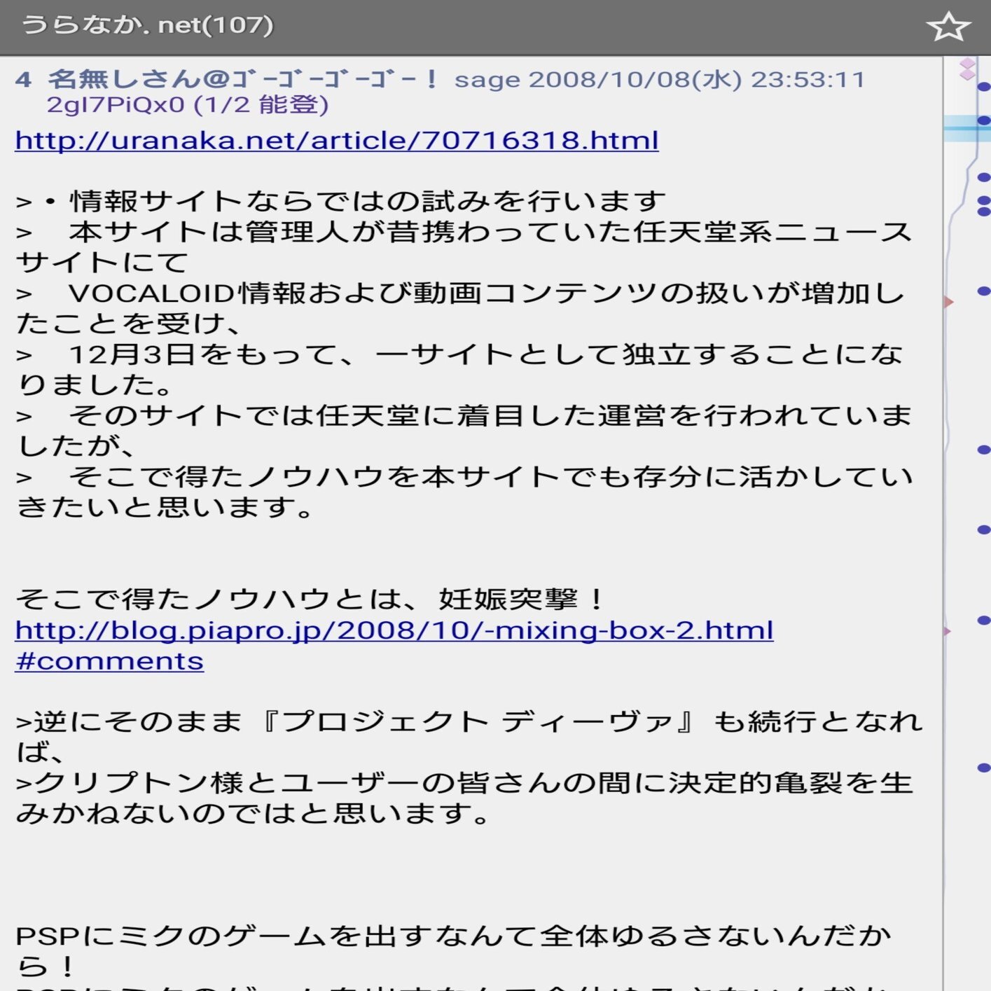 そういった中事態は一変します。2008年10月3日、初音ミクと他企業がコラボした際の不手際(詳細は不明)のお詫びとしてピアプロ(クリプトン社が運営するクリエイター交流サイト)の初音ミク公式アカウント(現在はコメント欄は閉鎖?)で声明を出した際に、うらなかは初音ミク公式アカウントに直接苦言を言い始め、それに乗じる形で初音ミはク -Project DIVA- の開発を中止、任天堂機での再開発をするよう呼びかけました。