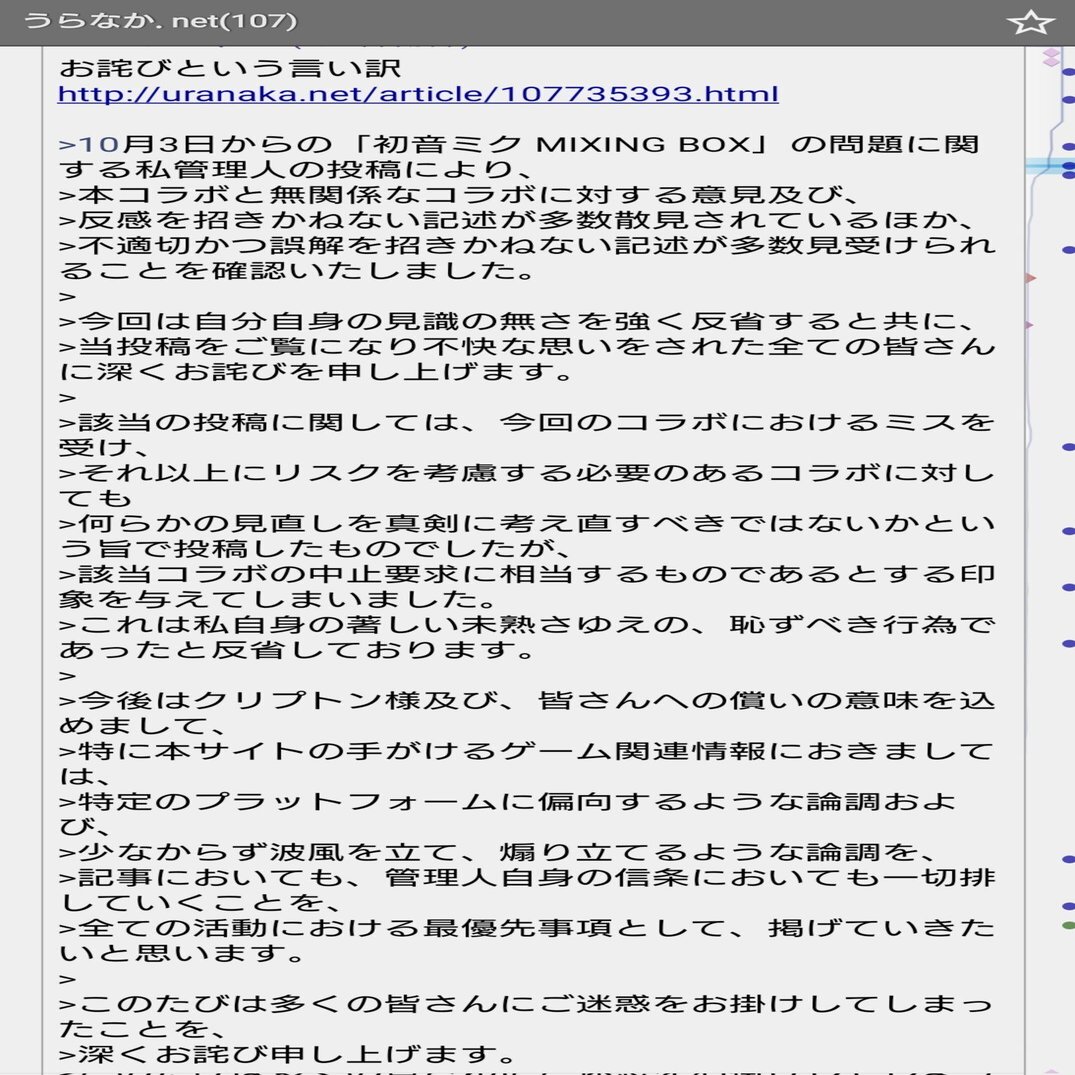 ちょうど偶然同じタイミングでうらなかは任天堂ニュースタイムズから独立し、うらなか.netを立ち上げており、ニコニコ動画を嫌っていたというのは前項でも説明しましたが、この騒動の事についても殊更強調していたのではないか?と推察しています。(そういった背景があったからか、うらなかに対し擁護的だった人たちの意見もうらなかの反ニコニコ動画の姿勢を評価しています。ただうらなか自身は初音ミクどうこうではなくネット民特有の親会社がKADOKAWAという大企業系がとりあえず嫌いという判官贔屓的なアレなだけな気がしますが。)