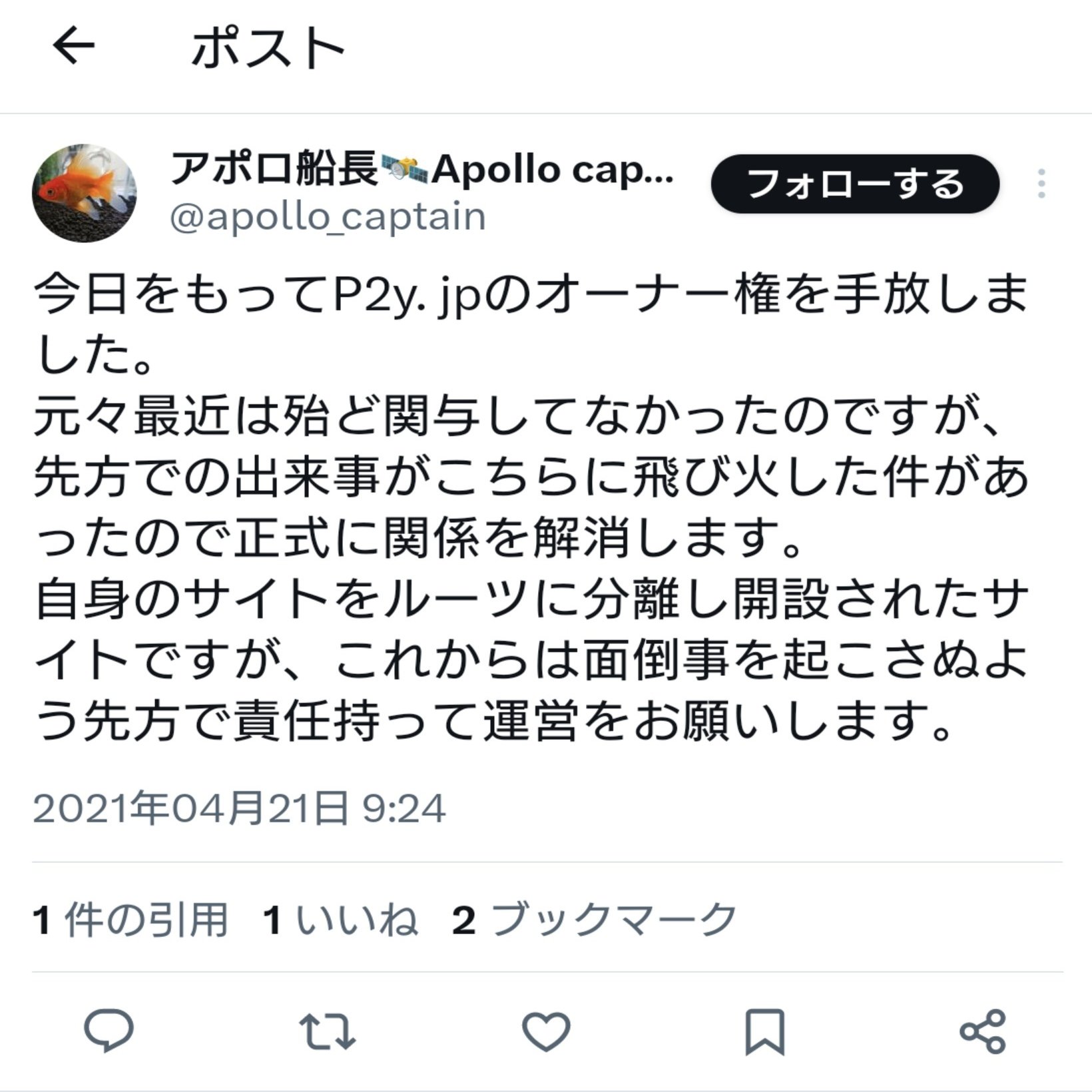 ⑤ 2021年アポロ船長が管理人を退くのと同時にP2y運営権をP2y第一チームに完全に譲渡