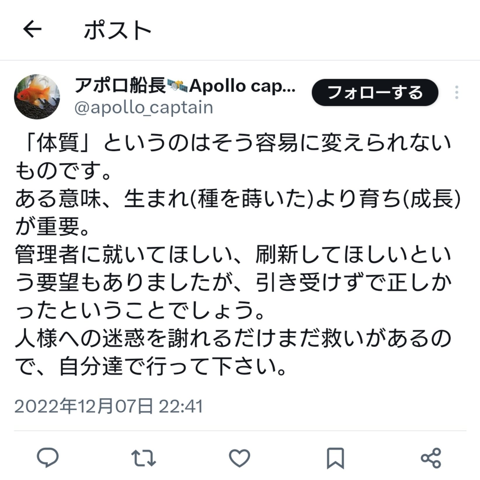 ※改めて第一回目のnoteで載せたアポロ船長のポストを載せておきます。