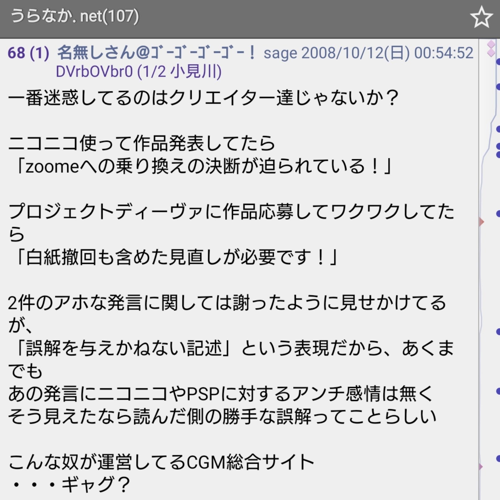 そして現にうらなかはニコニコ動画への騒動の当てつけであるかのように2008年初頭からzoomeでボカロ曲のランキング動画を作って活動し、うらなか.netではニコニコ動画に対するzoomeの優位性を説き、そしてボカロPにはzoomeで活動するよう煽動した。と考えると個人の主観まみれの理由でゲームの発売中止運動をするようなうらなかの偏執じみたその言動と辻褄が合う気がしてなりません。