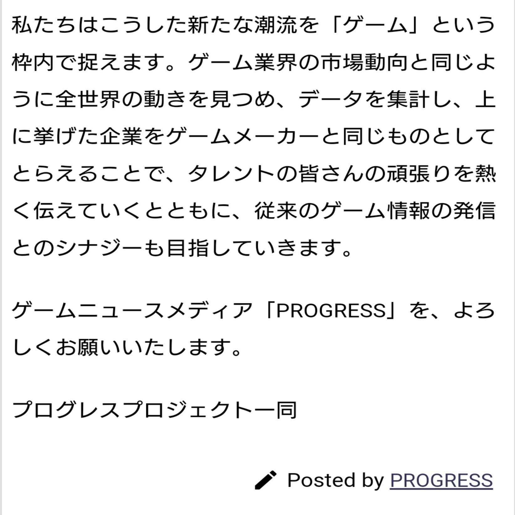 なお、以前紹介したVTuberメディアサイト「progress」でも文中では「私たちは~」と複数人であるような言い回しの文言がありながら「Posted by~」以降の署名用のIDがプロジェクト名なのか個人名なのかよくわからないという似たような傾向の文章が存在します。(P2yでもそういった傾向の印象を抱いた人は多いのではないでしょうか?)