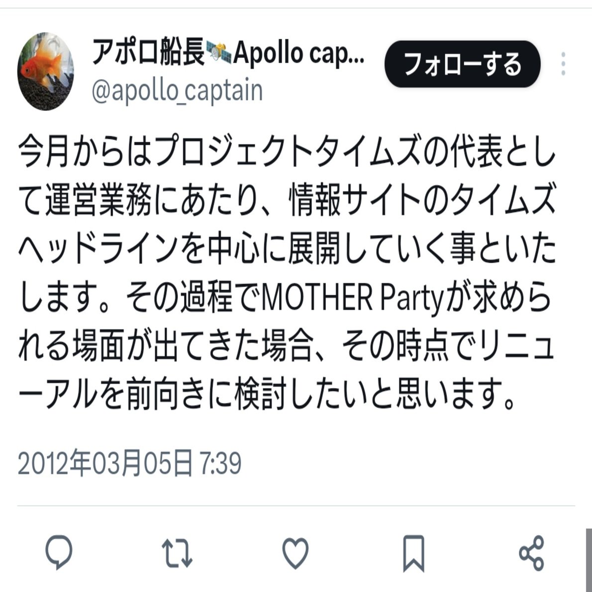 なお、調べた限り実はタイムズヘッドライン開設当初は管理人が誰なのか不明だったりします。(調べた限りでは匿名の管理人という体裁で運営がされていたようです。詳細は次回のnoteで述べたいと思います。)アポロ船長のXによるとアポロ船長はプロジェクトタイムズの代表に就いたかのような内容を2012年3月にポストしています。