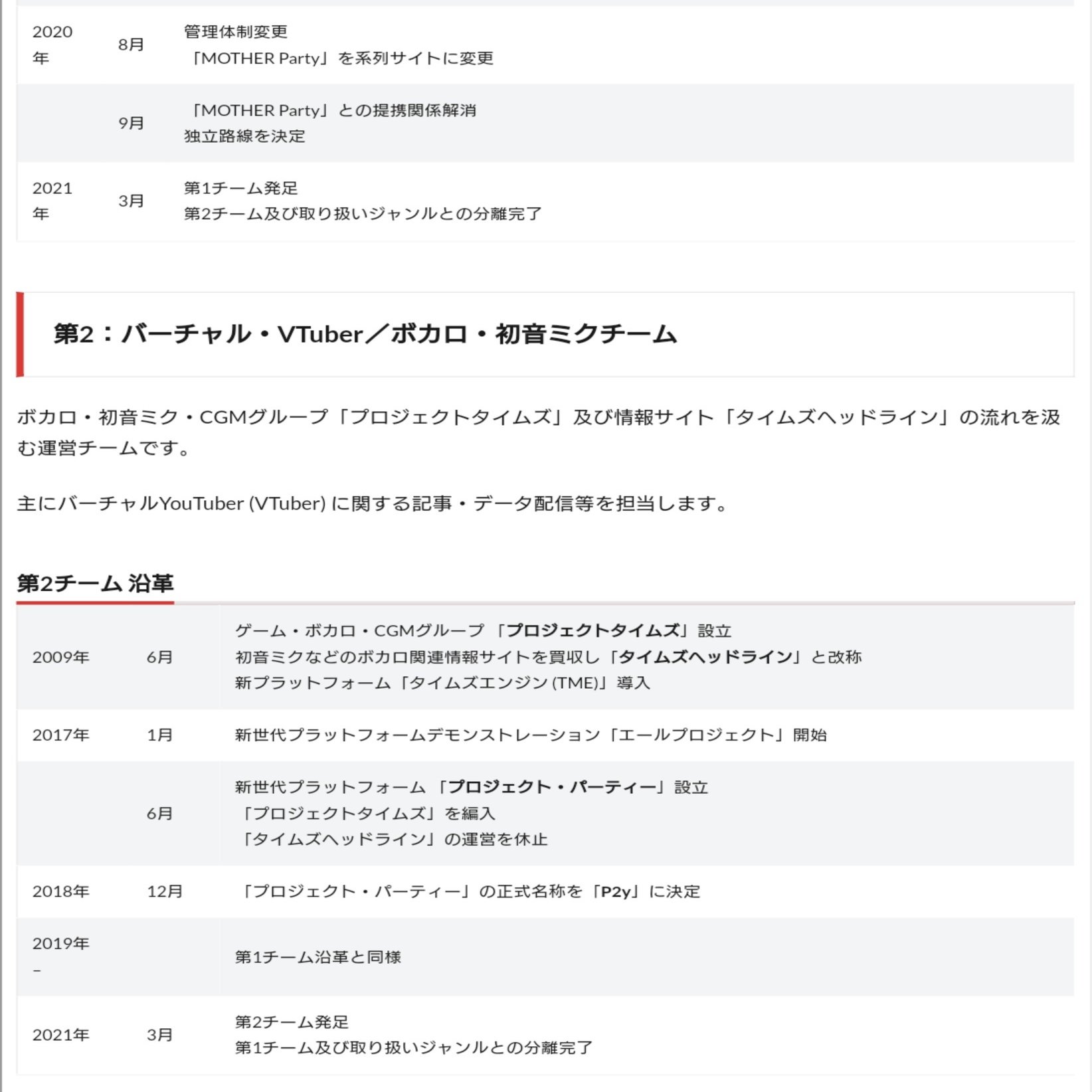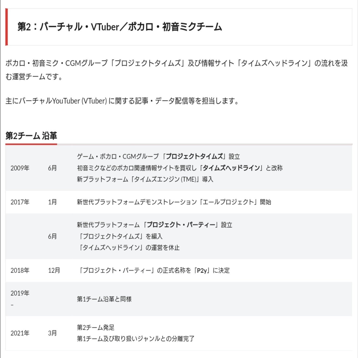 また改めてP2y第二チームの沿革を見るとプロジェクトタイムズはタイムズヘッドライン系譜からの発足であり、のちのプロジェクトパーティーへの移行からP2y閉鎖までの流をP2y運営時のチームの名義ベースで置き換えて説明すると