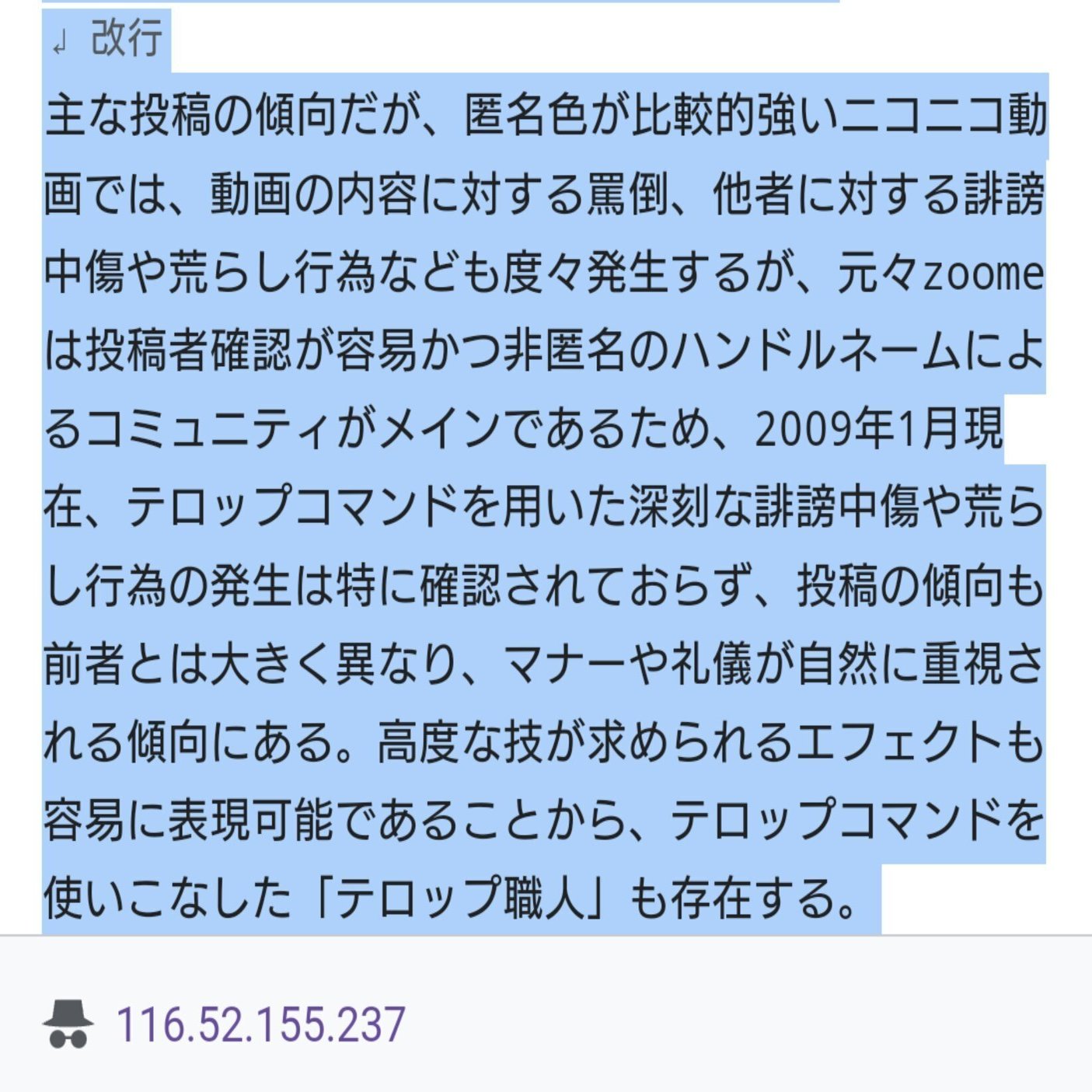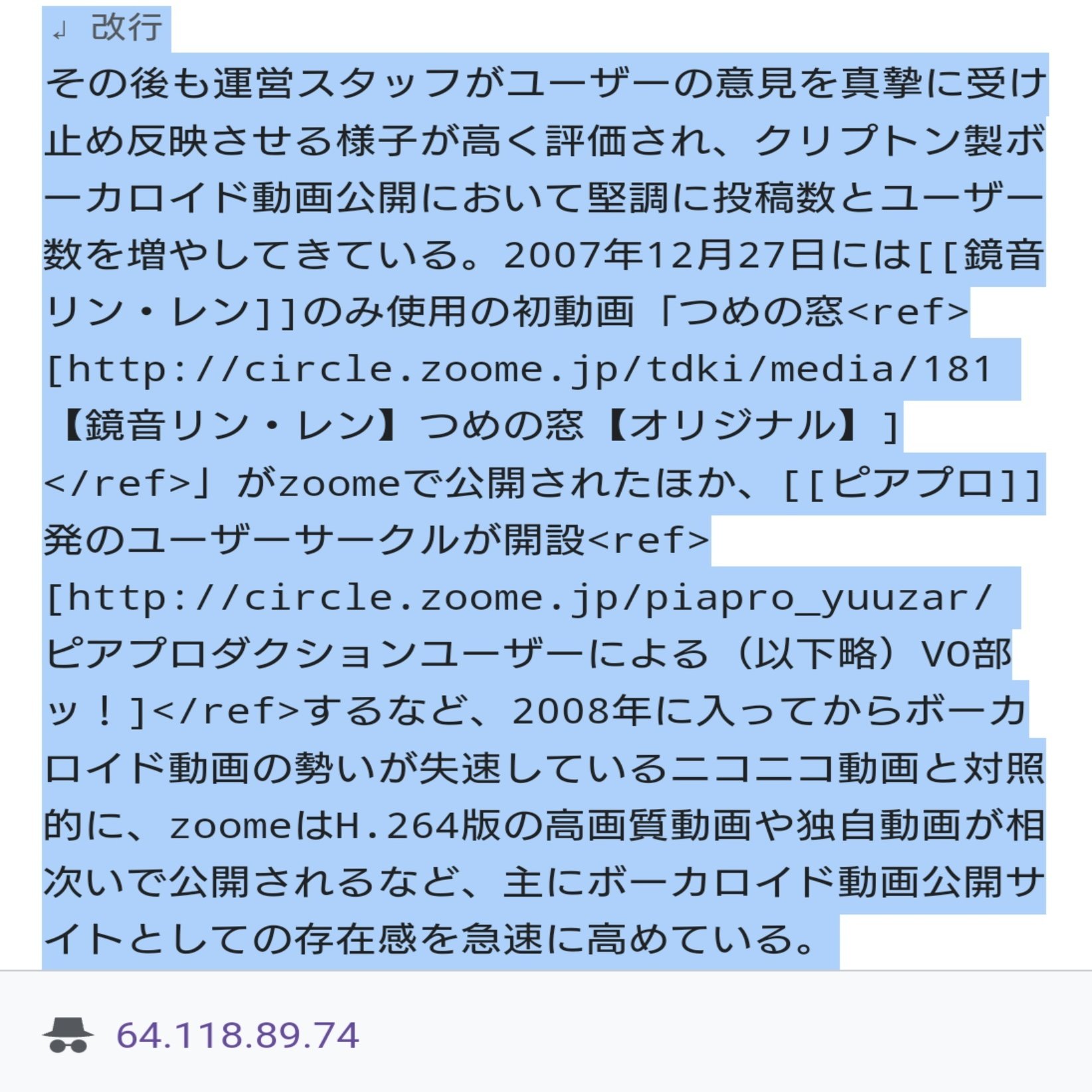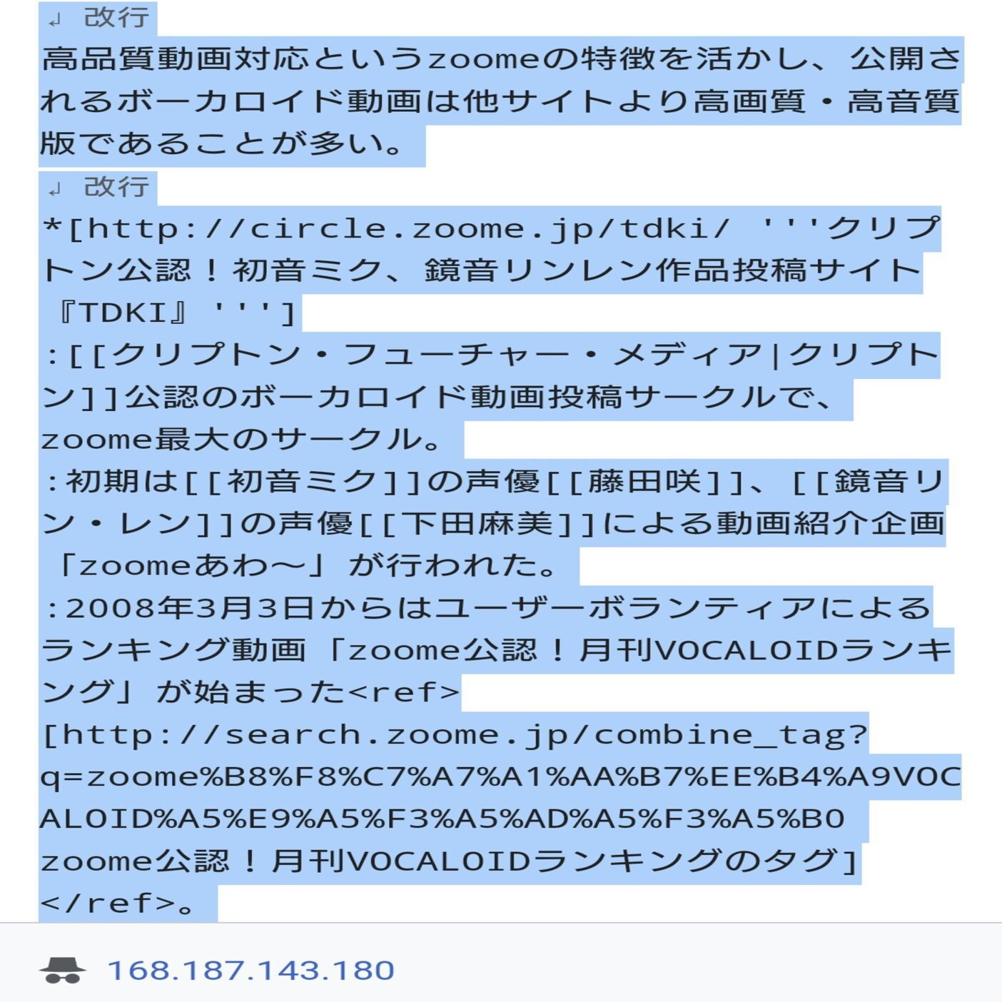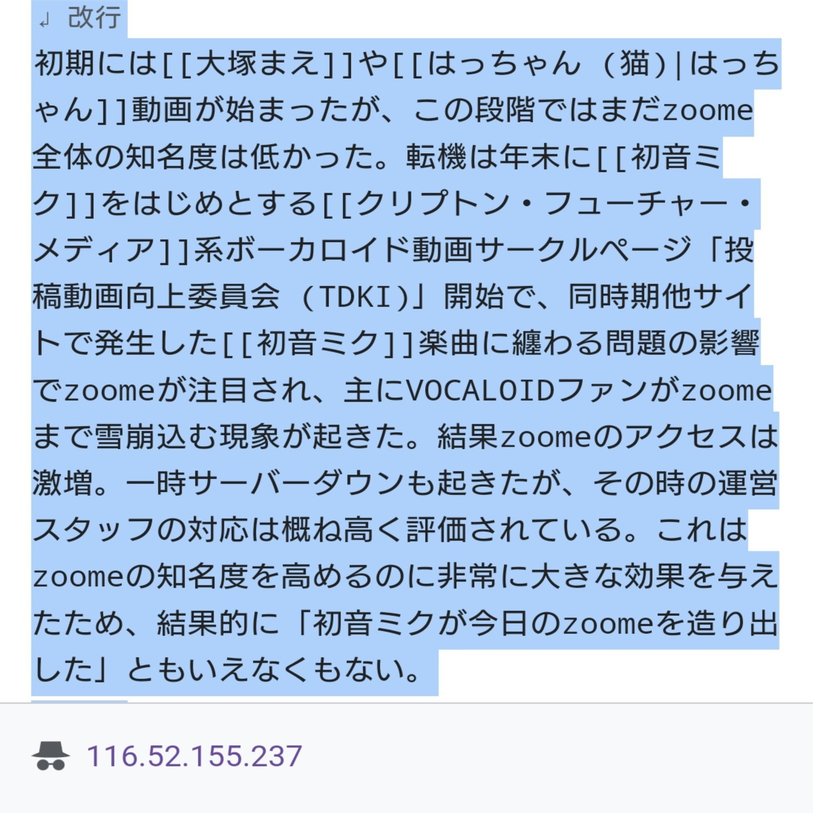 このzoomeのWikipediaの編集履歴の中にはうらなかの活動期間中、ニコニコ動画に対するzoomeの優位性、zoomeにおける初音ミク関連コンテンツの影響の大きさ、zoomeユーザーが如何にニコニコ動画ユーザーより民度が優れているか等を複数のIPアドレスによる不特定多数の匿名ユーザーが執拗に繰り返し編集している事を確認しました。