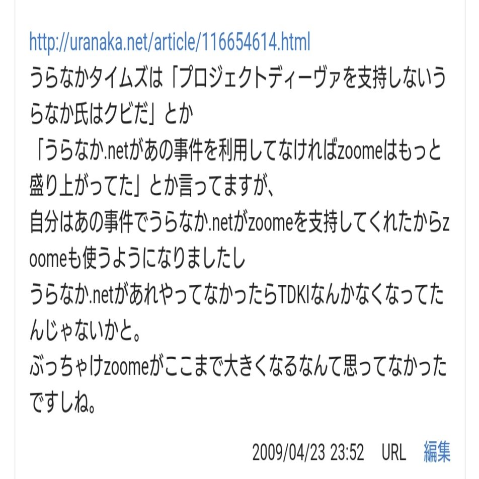 仮にこれらのWikipediaの書き込みが前回とりあげたアポロ船長の弟やMOTHER連合と思われる不自然な編集と同じようにうらなかが自身の功名心のためにzoomeを過度に持ち上げる編集を行っていたり、タイムズヘッドラインの当時の匿名代表が引退したうらなかにその責任をすべて押し付けてzoomeのネガキャンをしようと編集していたと疑うのも決して不自然なことではないと思います。
