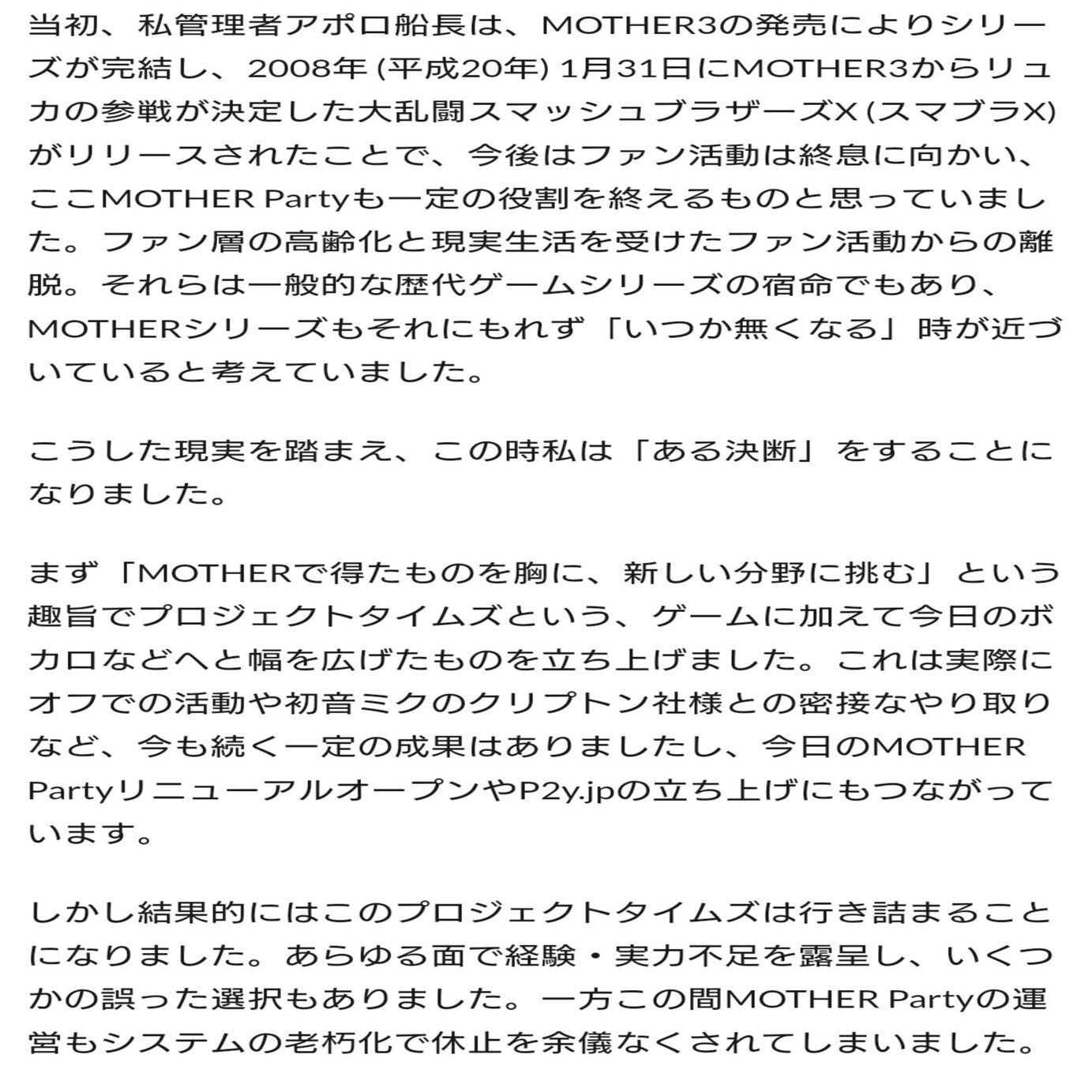 ただ、アポロ船長が2012年3月にプロジェクトタイムズ運営代表に就任し、後の後継であるプロジェクトパーティーへ移行&そこから退任する2021年4月までプロジェクトの主導をとっていたとするのであれば、先述したP2y第一チームの沿革にある2012年の出来事としてアポロ船長が直接運営しているMOTHER partyをプロジェクトへの「編入」としているのは表現として不適切に感じました。(どの立場からこの沿革を書いていたのかいまいちわかりづらいと思います。代表であるアポロ船長自身がMOTHER party所属の記者を呼び寄せたということでしょうか?)