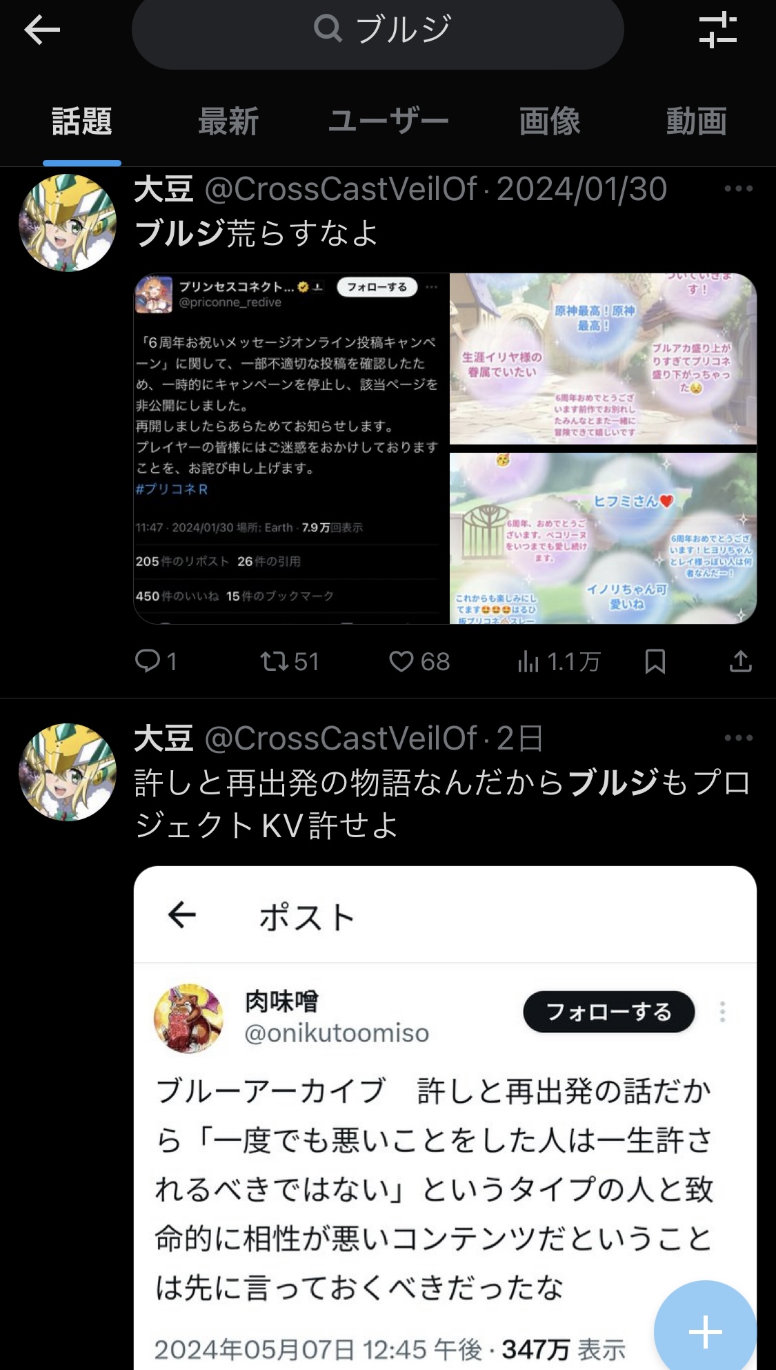 このプリコネ荒らしてた当事者が「ブルジ」て最初に使い始めた連中なのはなかなか面白いですねェ