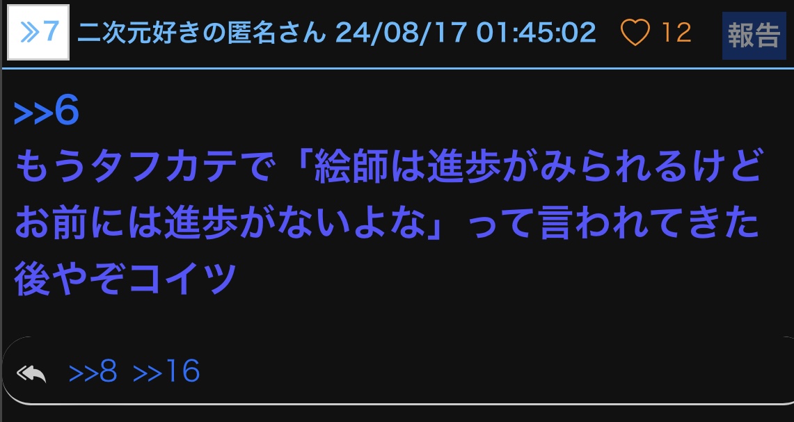 感じる知能あったら荒らしなんかやっとらんけどなブヘヘ - 16二次元好きの匿名さん24/09/04(水) 15:12:04