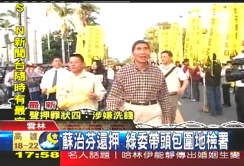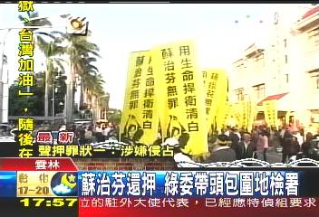 高舉「用生命捍衛清白,蘇治芬無罪」,還有「司法死亡」的旗幟,民進黨號召1、2百名支持者包圍地檢署,聲援縣長。民進黨立委:「聲援縣長,司法不公!聲援縣長,司法不公!」