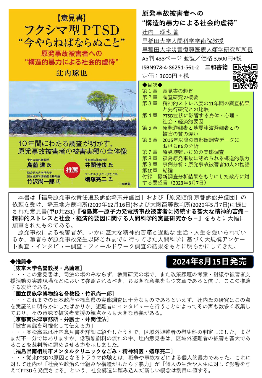 このたび「福島原発事故責任追及訴訟埼玉弁護団」および「原発賠償 京都訴訟弁護団」の依頼を受け、埼玉地方裁判所(2019年12月16日)および大阪高等裁判所(2020年5月7日)に提出された意見書(甲D共231)『福島第一原子力発電所事故被害者に持続する甚大な精神的苦痛-精神的ストレスと社会・経済的要因に関する人間科学的実証研究から-』をもとに大幅に加筆した書籍が、三和書籍から刊行される機会を得ました。