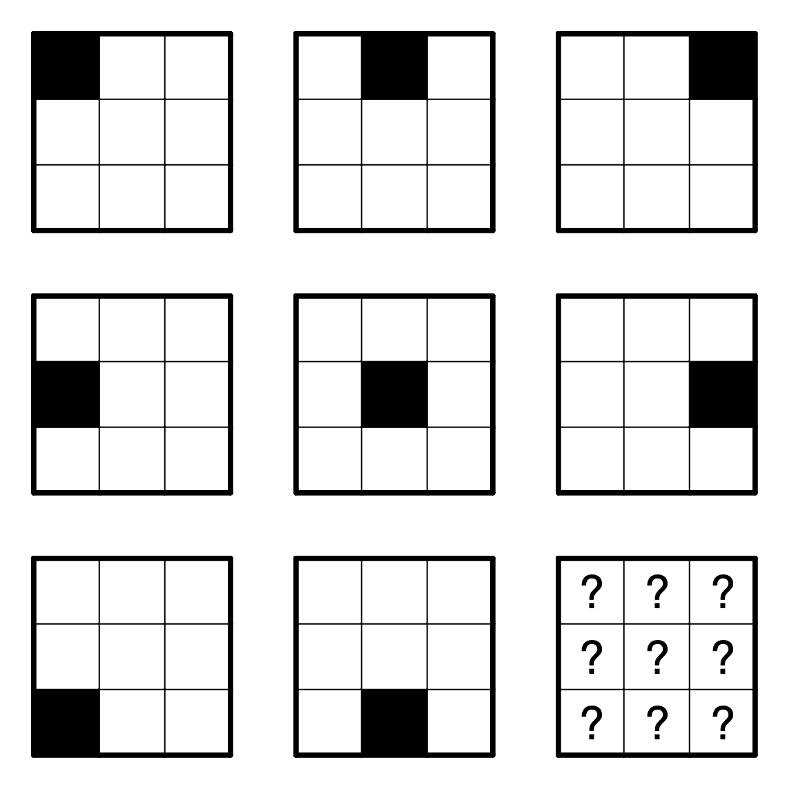 行列推理(Matrix Reasoning)とは、並んだ図形から法則性を見抜き、空欄マスに入る図形を当てる問題です。