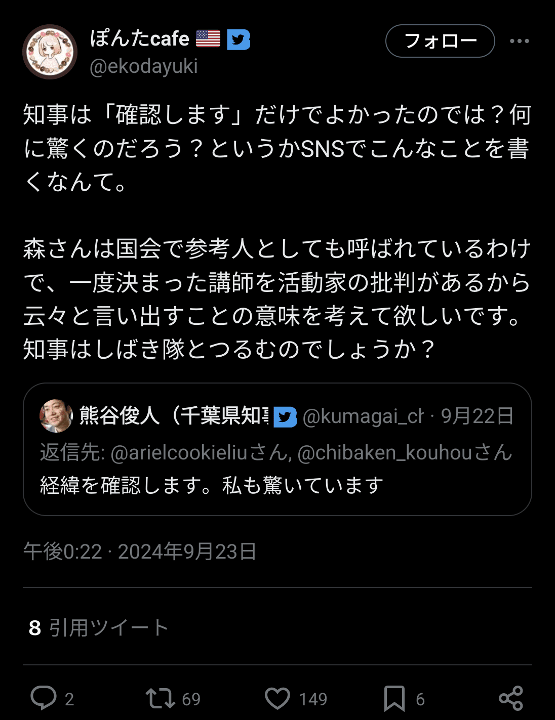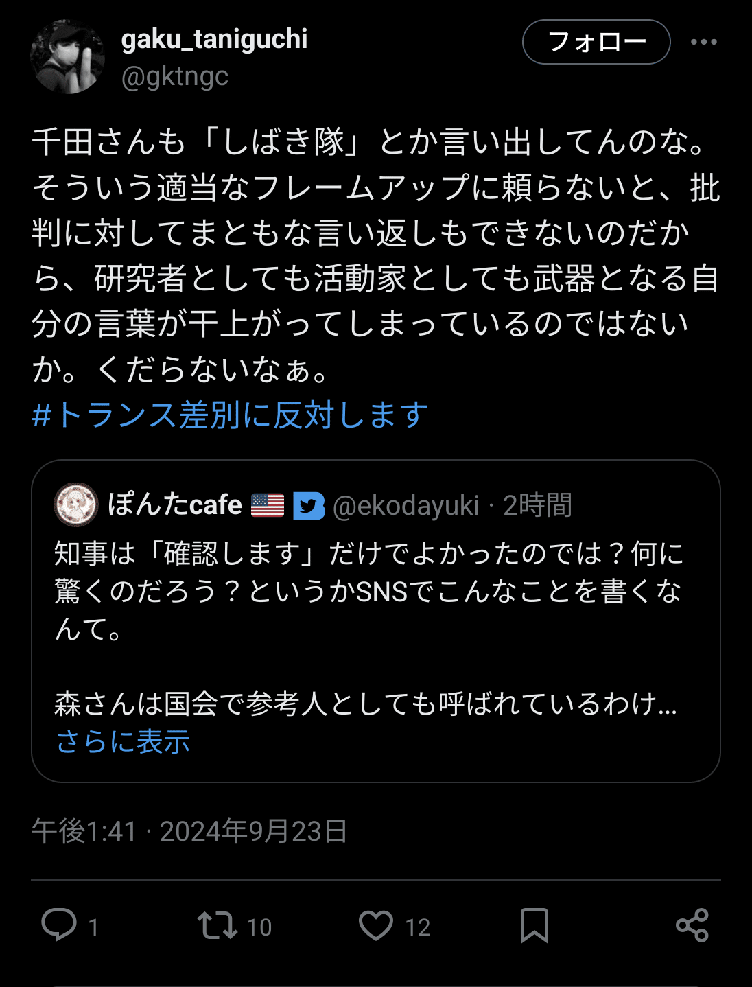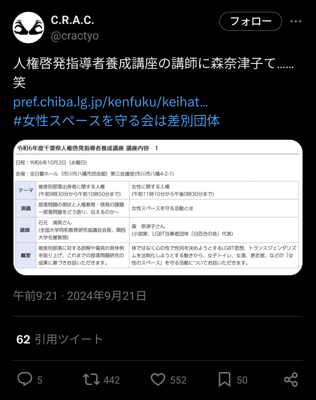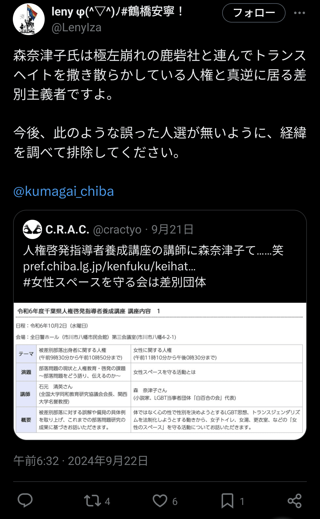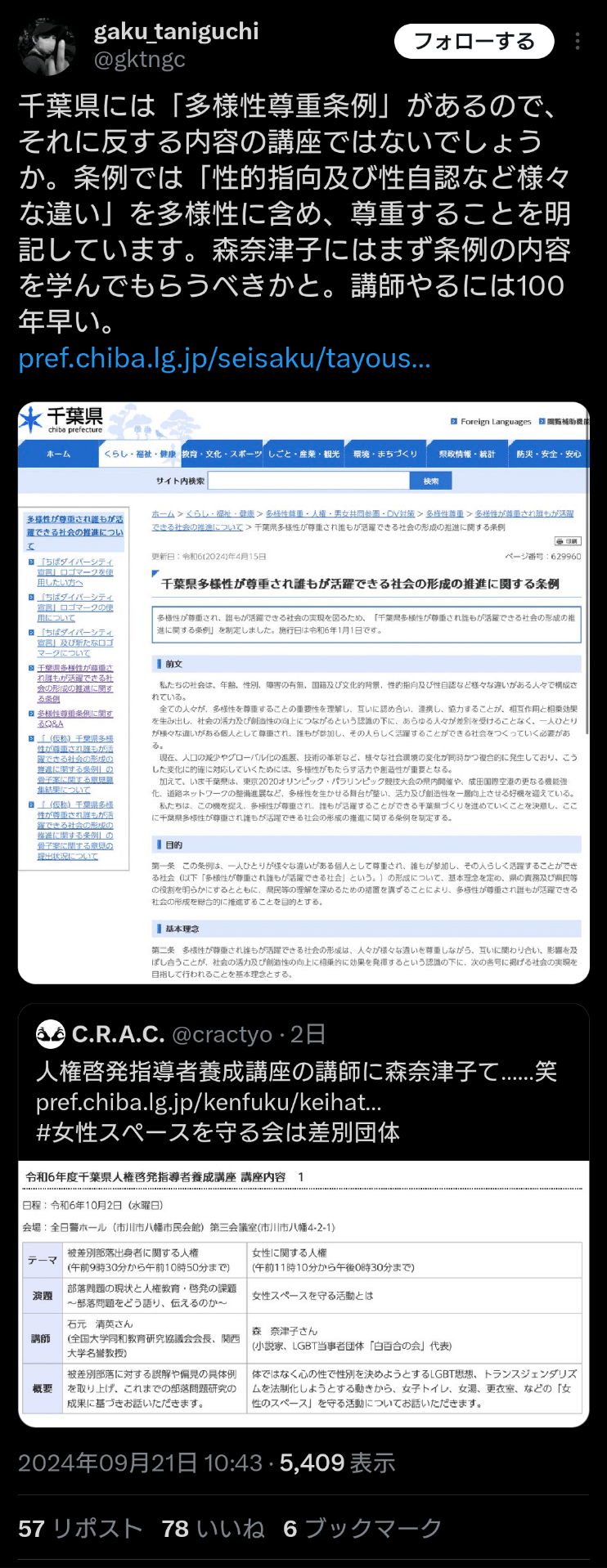 千葉県人権講座に森奈津子→しばき隊発狂→熊谷市長「調査します」→千田有紀「しばき隊とつるむんですか!」→谷口岳さん「千田有紀には失望した」|田山たかし
