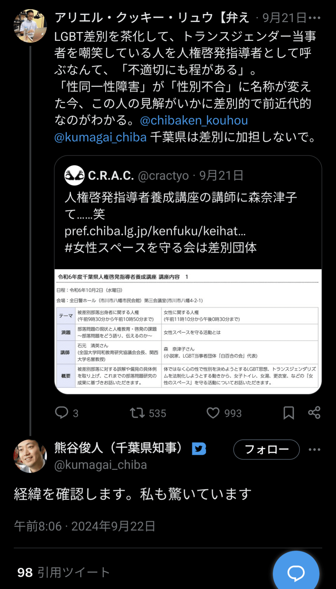 千葉県人権講座に森奈津子→しばき隊発狂→熊谷市長「調査します」→千田有紀「しばき隊とつるむんですか!」→谷口岳さん「千田有紀には失望した」