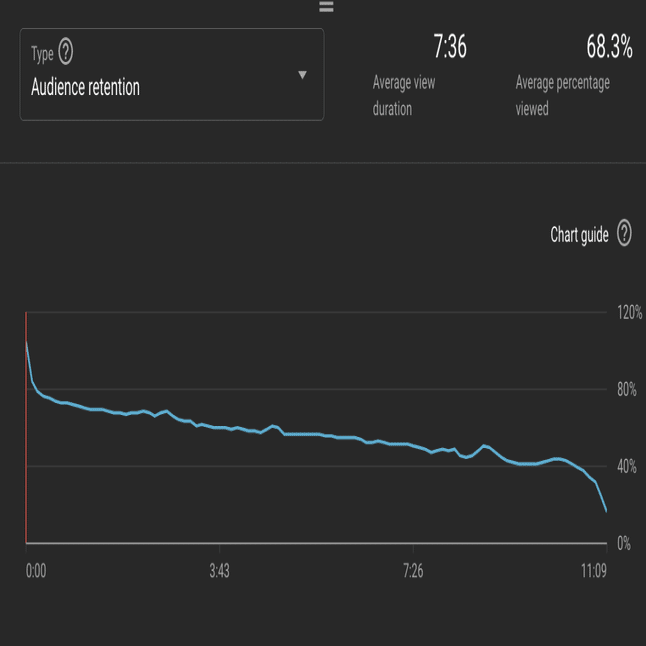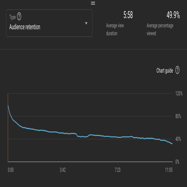 YouTubeの良いところは、アナリティクスが充実していて、視聴者がいつ動画から離脱したのかを秒単位で記録した、詳細なグラフを出してくれることです。