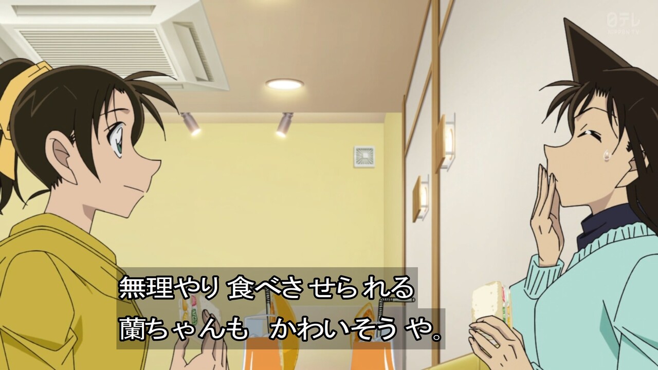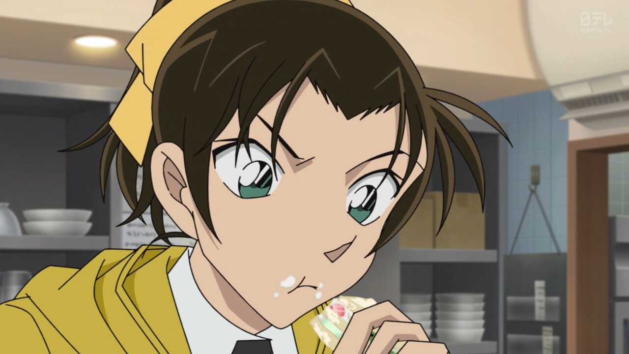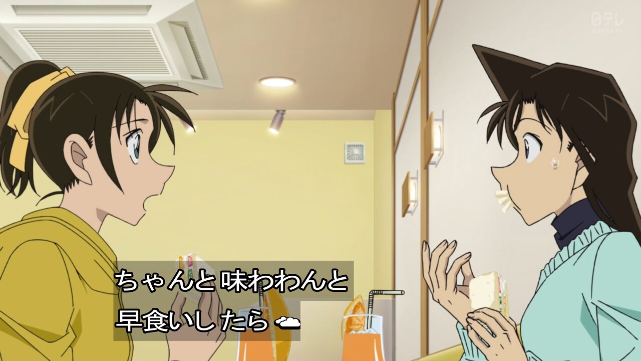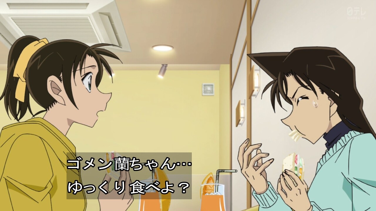 - フルーツサンドを口の中に詰め込む蘭の絵面、原作よりもアニメのほうが笑えた