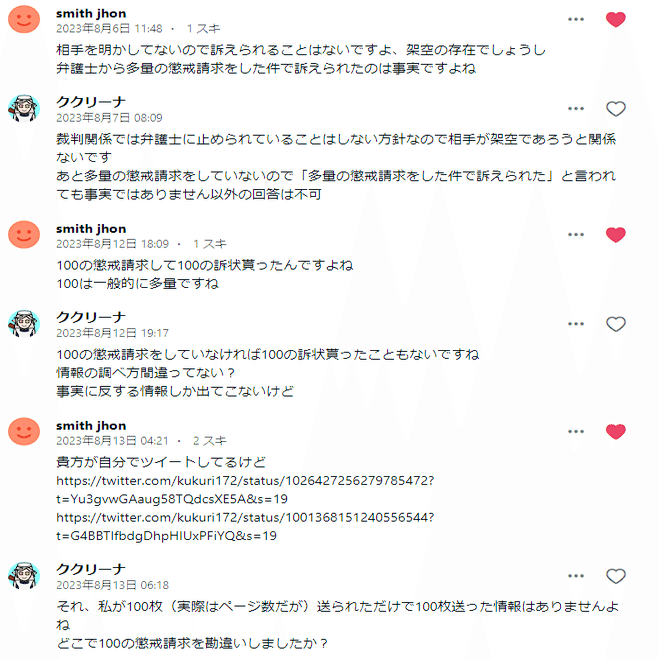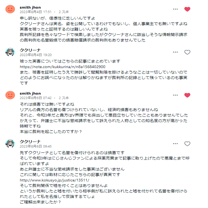 仮に裁判していたらあまりにもヤバいことになってます。スクショは一例ですがnoteでこれだけどったんばったん大騒ぎしてたら普通に考えてククリーナ氏に対する心証が低くなるかと思われます。その他もろもろ提出済みです。