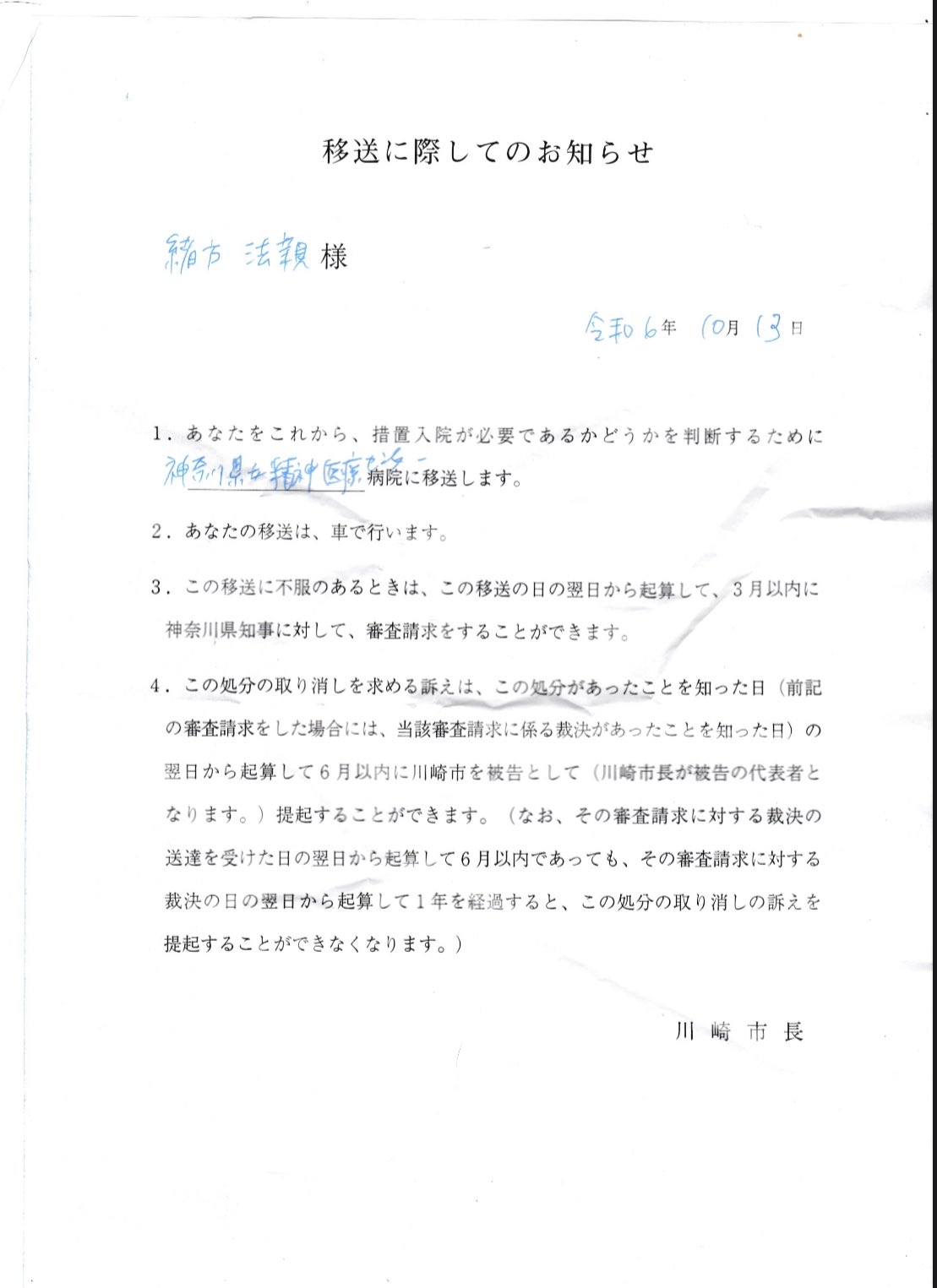 ヘイト条例を作るくらい人権を尊重してるはずの川崎市で、市長の権限のもとに「勝手に特定の人を精神病だと決めつけて、強制的に移送した」という事例。