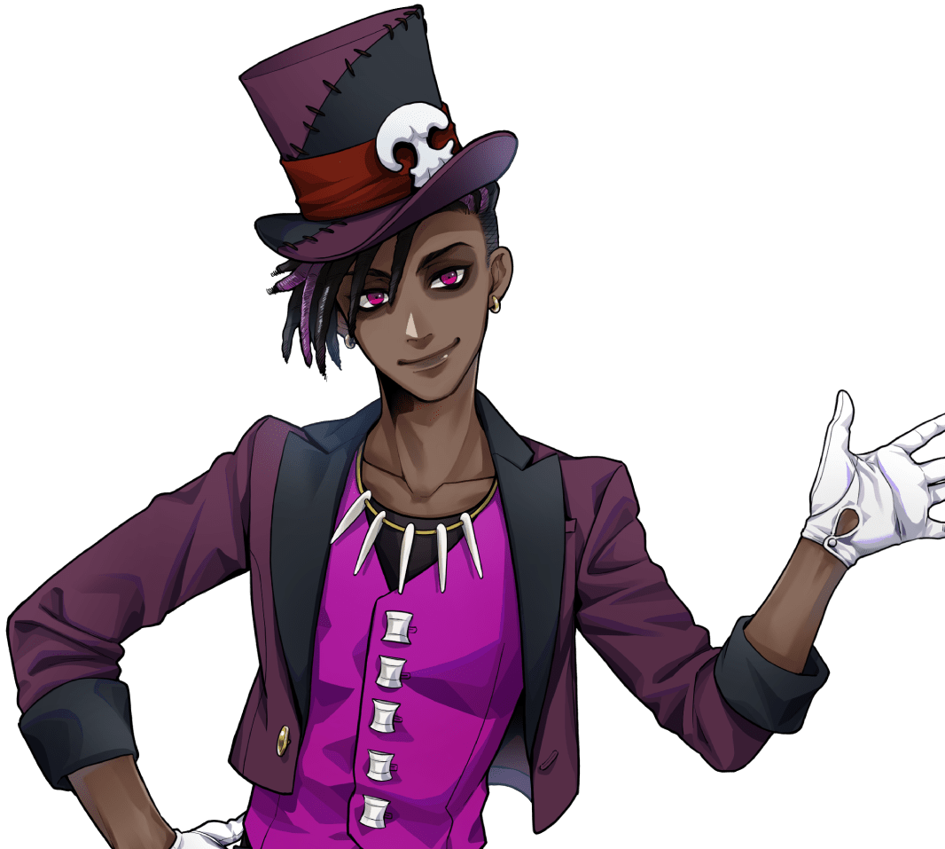 Sam is a lithe young man with magenta eyes, black-and-purple locs flipped over the right side of his head, and an undercut. Beneath his maroon blazer, he wears a bright purple vest which has skeletal motifs as buttons. He wears a hat which is sewn together of maroon and black colored parts. He has a small skull affixed to his a red clothing wrapped around the hat. He wears a necklace decorated with long, tooth-looking bones.