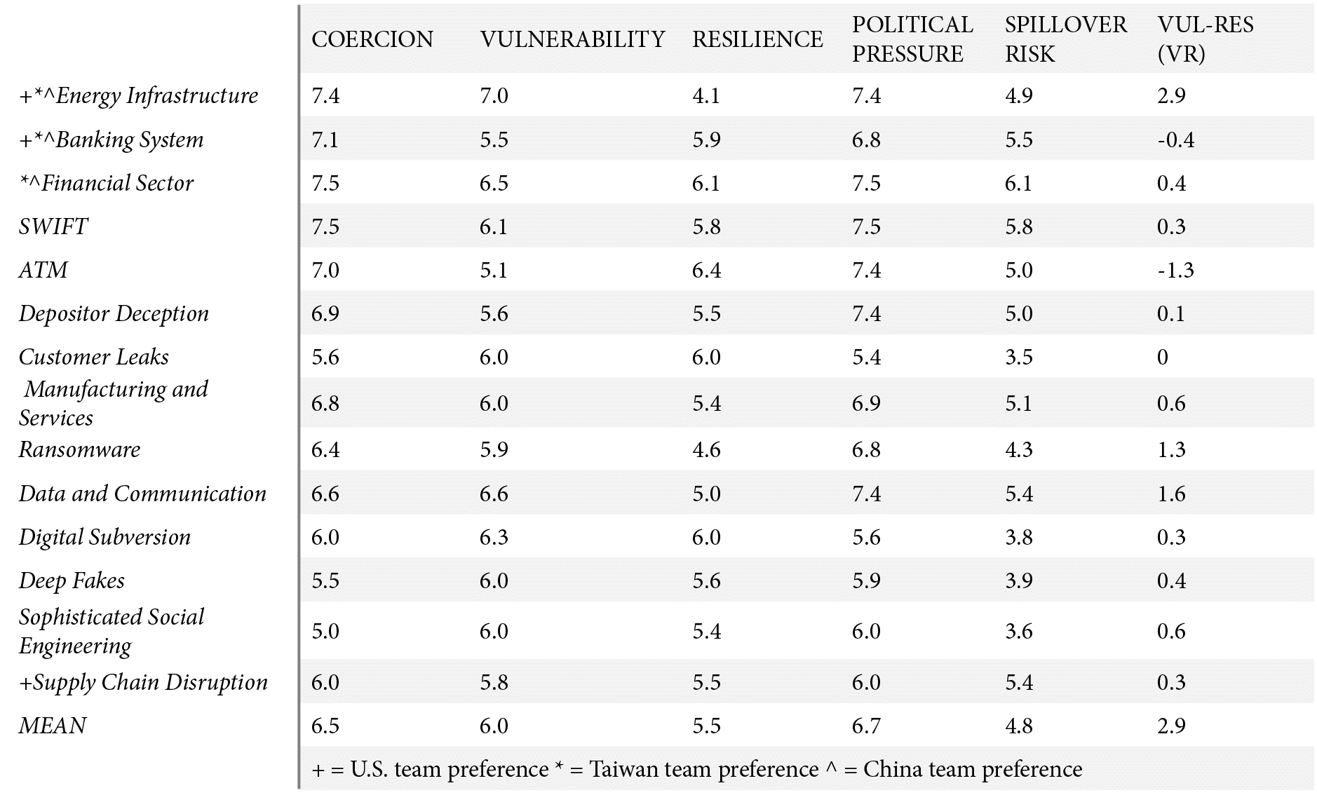 Lastly, players assessed that complex cyberattacks against the financial system (6.1) were most likely to cause spillover effects. Players were generally concerned with how a major attack could not only undermine confidence in Taiwan but also spread through the region. Multiple participants referenced historical precedents for the interconnectedness of markets in the Asia-Pacific.