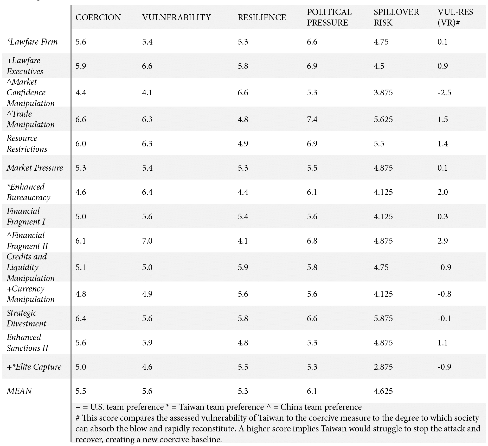 Players assessed that Taiwan would experience the most political pressure from trade manipulation (7.4), followed by lawfare measures targeting executives (6.9) and resource restrictions (6.9). Forms of lawfare were prominent in both the U.S. and China team recommendations and reflected how China could adopt low-cost coercive measures.