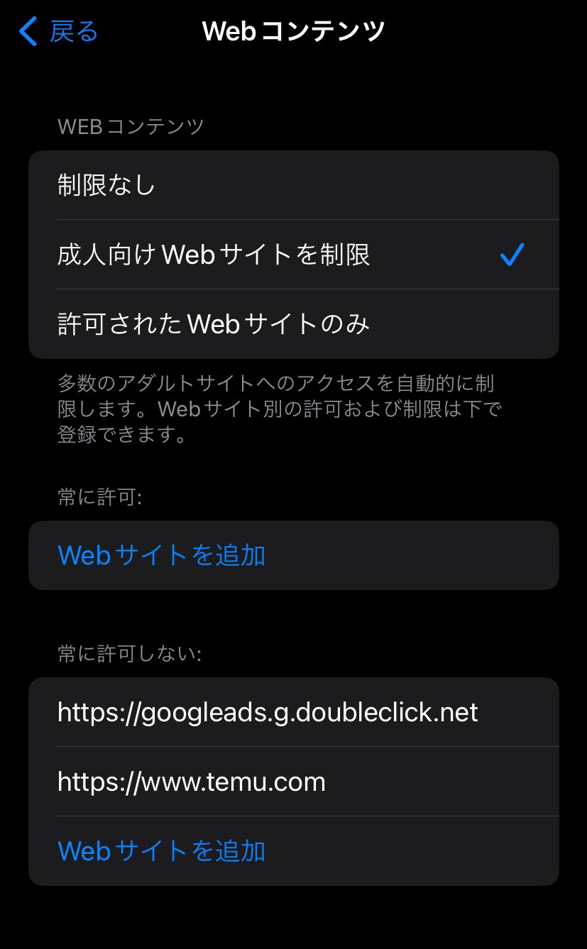 設定→スクリーンタイム→コンテンツとプライバシーの制限→ストア、Web、Siri、およびGame Centerコンテンツ→WEBコンテンツ(続)