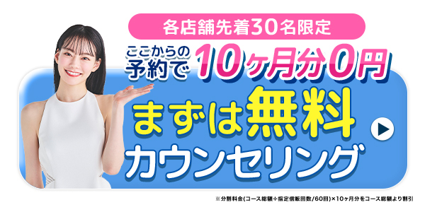 - ※1分割料金(コース総額÷指定信販回数(60回))×6ヶ月分をコース総額より割引※2痛みには個人差があります。※3お友達紹介キャンペーンで適応。詳細は来店時にご確認ください。※プラチナプラン完了コースをご契約いただいた方