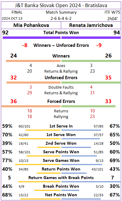 Jamrichova still had a couple of chances to break back, one in the 4th game and another in the 6th. But the first break point was neutralized by a Pohankova forehand winner and the second wasted with a forehand error.
