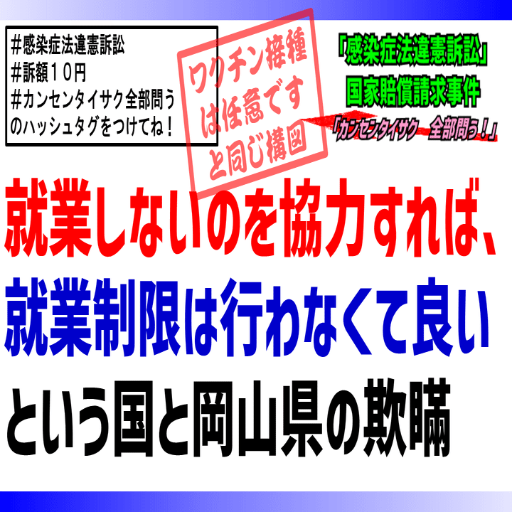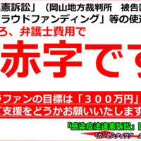 昨年夏に新型コロナ陽性→就業制限と行政罰は違法・違憲と考え、令和5年4月14日に国・岡山県を提訴しました。争点は「新型コロナによる就業制限(ならびに就業しないことへの協力要請)が違憲かどうか」等です。 裁判にあたり皆様のご支援が必要です。 どうか、ご支援のほどお願いいたします。