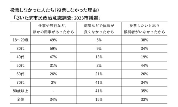 さいたま市民の政治意識調査によると、「投票したいと思う候補者がいなかったから」という理由で投票しなかった50〜60代は、20代と遜色ないくらいの数字になっています。
