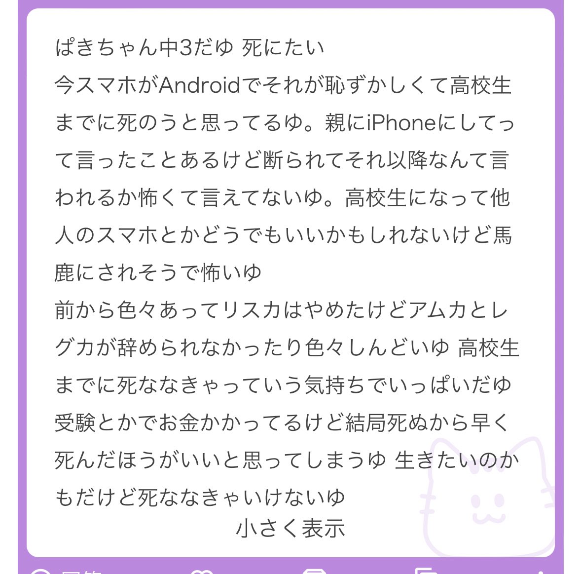 私前までAndroidで、それで満足してたの。でも高校上がってから「iPhoneじゃないの?!可哀想😢」ってめっちゃ言われるようになったよ😭iPhoneが完全にキラキラJKのステータスになってた。