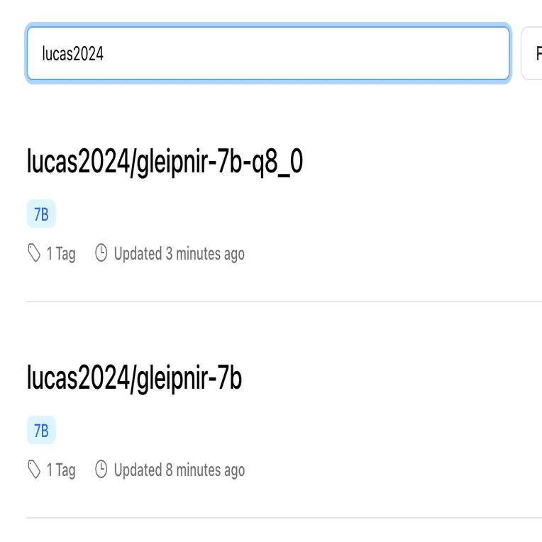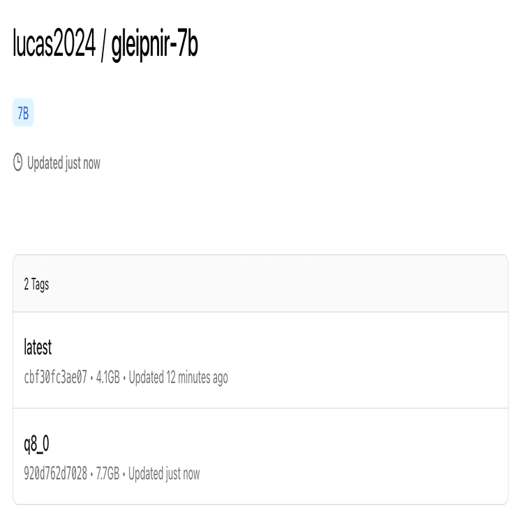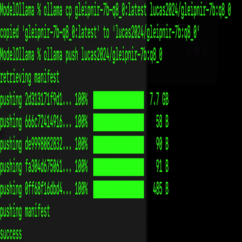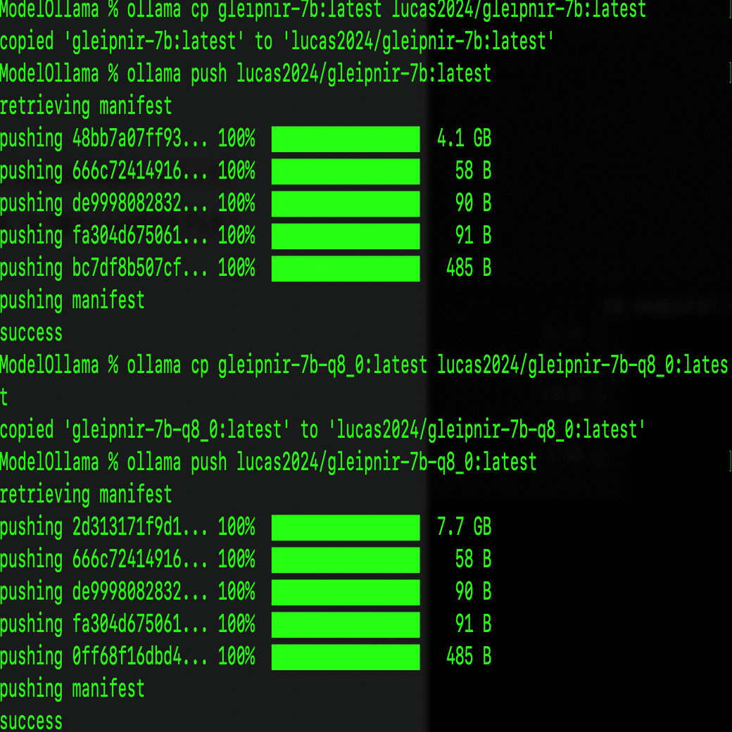 ollama create --quantize q8_0 -f ModelfileForLlamastyle gleipnir-7b-q8_0以前の記事通りにpushします。