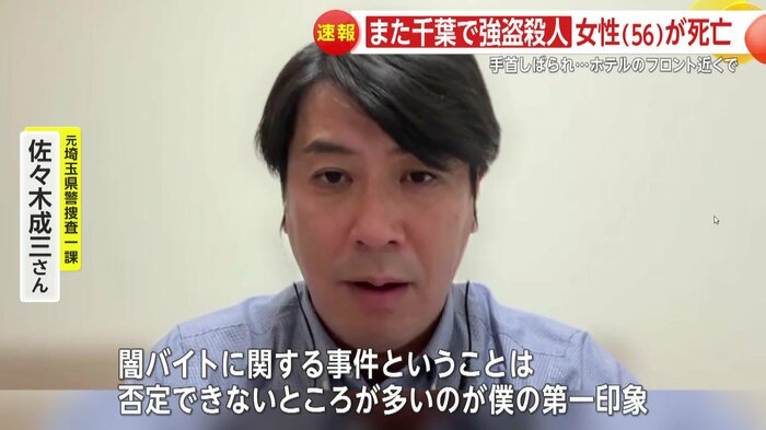 元埼玉県警の佐々木成三さんは「発生しているエリアが千葉ということ、対象は変わっているが、緊縛しているという状況。かなり手荒・稚拙な犯行という状況に関しては、類似している部分も多いと思うので、闇バイトに関する事件ということは、否定できないところが多いのが僕の第一印象」と指摘する。