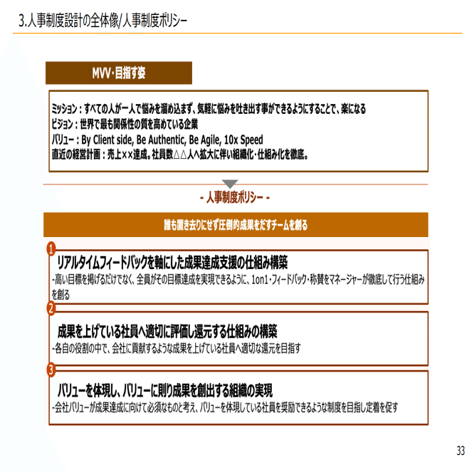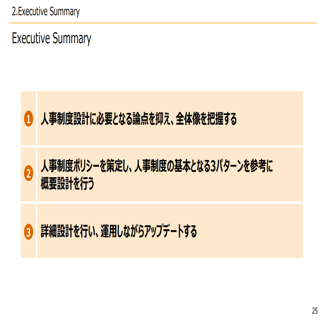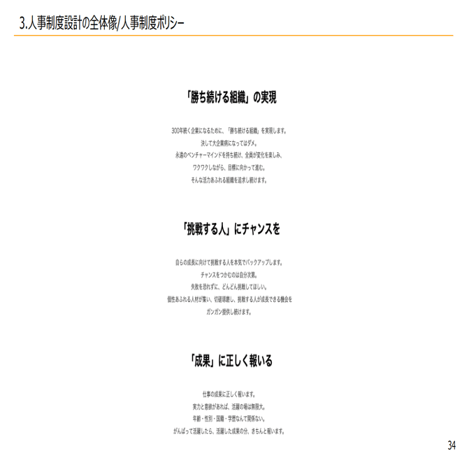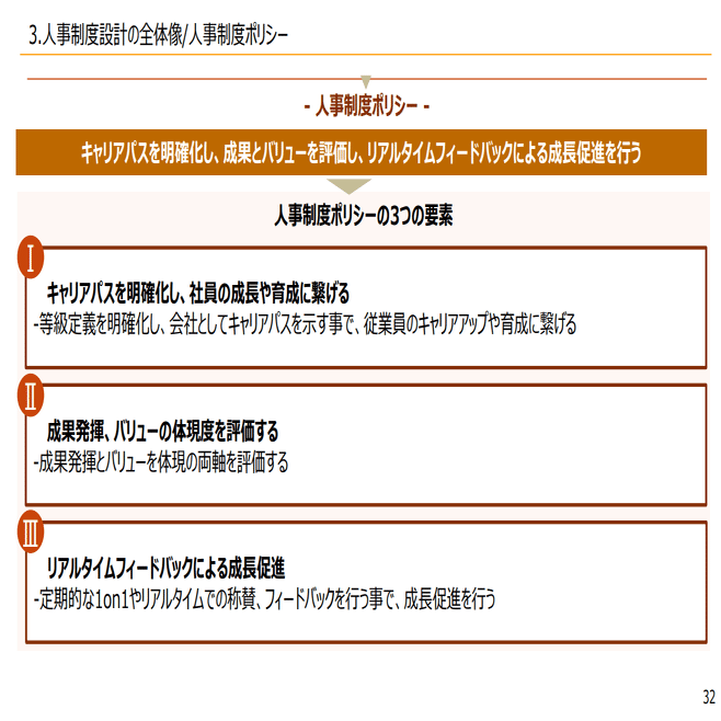 2つ目は、人事制度ポリシーを作って、先ほどの3パターンを参考に、概要を設計していくこと。