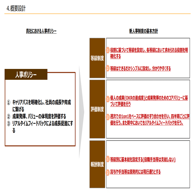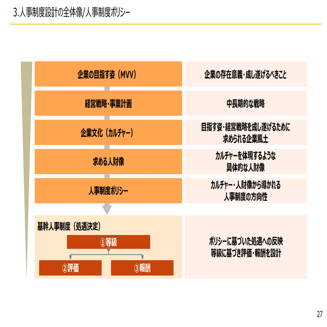 やはり人事制度ポリシーをまず最初に作って、概要設計して、そっから詳細を設計するという流れで進めていくことがとても大事になるかと思います。